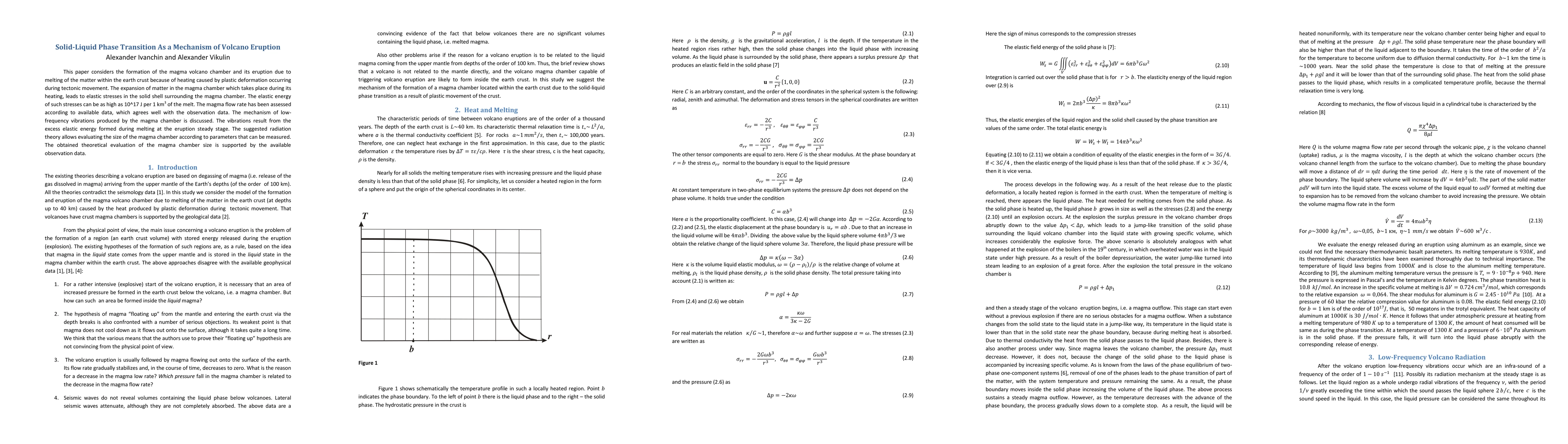 This paper considers the formation of the magma volcano chamber and its eruption due to melting of the matter within the earth crust because of heating caused by plastic deformation occurring during tectonic movement. The expansion of matter in the magma chamber which takes place during its heating, leads to elastic stresses in the solid shell surrounding the magma chamber. The elastic energy of such stresses can be as high as 10^17 J per 1 km3 of the melt. The magma flow rate has been assessed according to available data, which agrees well with the observation data. The mechanism of low-frequency vibrations produced by the magma chamber is discussed. The vibrations result from the excess elastic energy formed during melting at the eruption steady stage. The suggested radiation theory allows evaluating the size of the magma chamber according to parameters that can be measured. The obtained theoretical evaluation of the magma chamber size is supported by the available observation data.