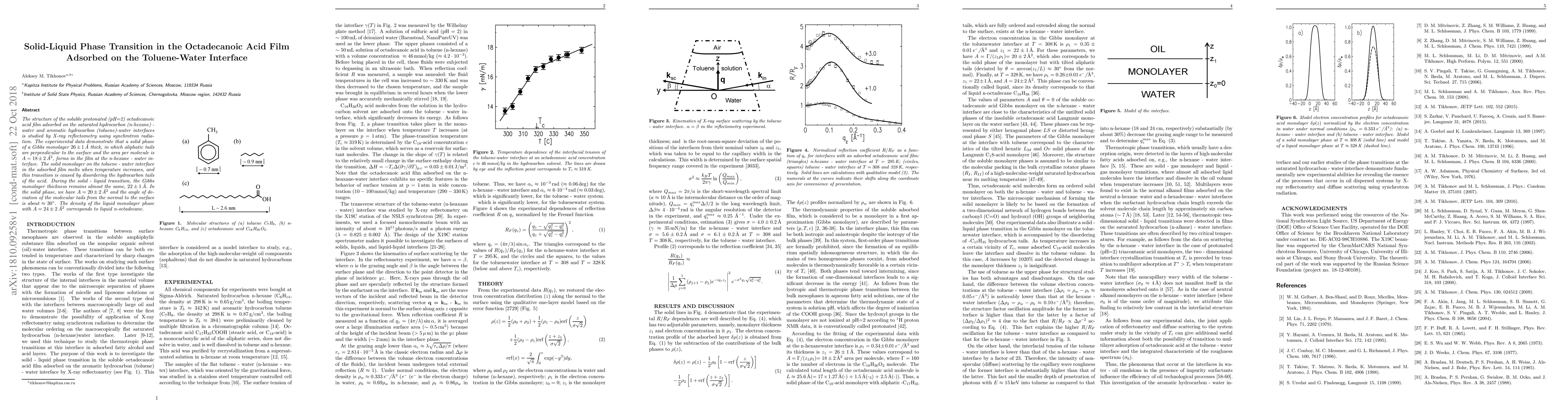 This study investigates the solid-liquid phase transition of octadecanoic acid films at n-hexane-water and toluene-water interfaces using X-ray reflectometry. The film forms a solid monolayer at the n-hexane-water interface, while it melts at the toluene-water interface upon temperature increase, maintaining a constant monolayer thickness.