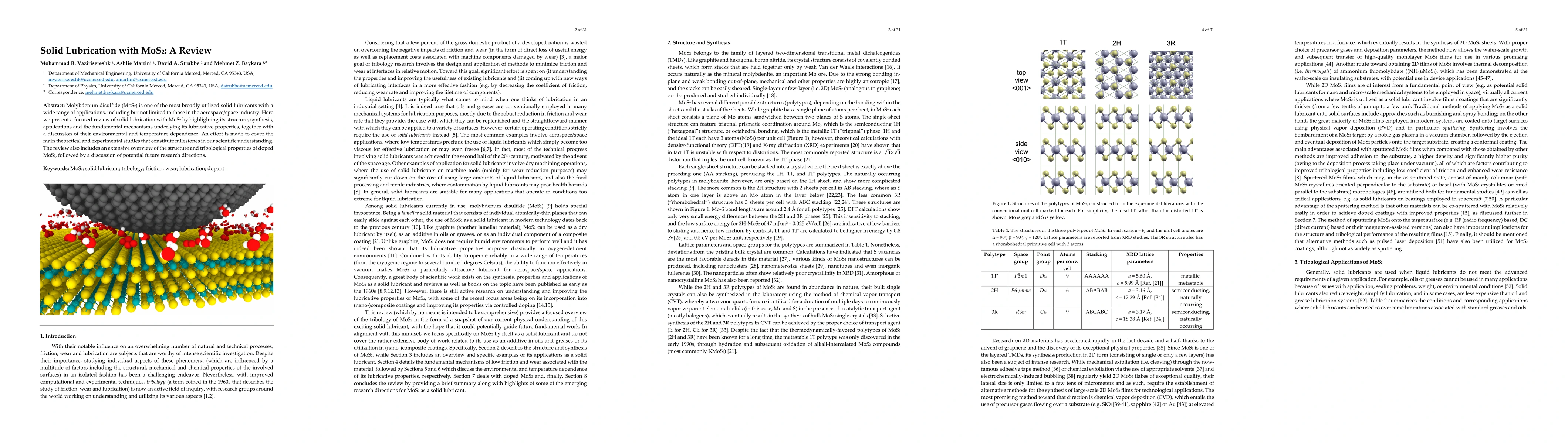 This review explores the widespread use of molybdenum disulfide (MoS$_2$) as a solid lubricant, examining its structure, synthesis, applications, and the mechanisms behind its lubrication properties. It highlights the environmental and temperature impacts on its performance and discusses doped MoS$_2$ variants, along with future research potentials.