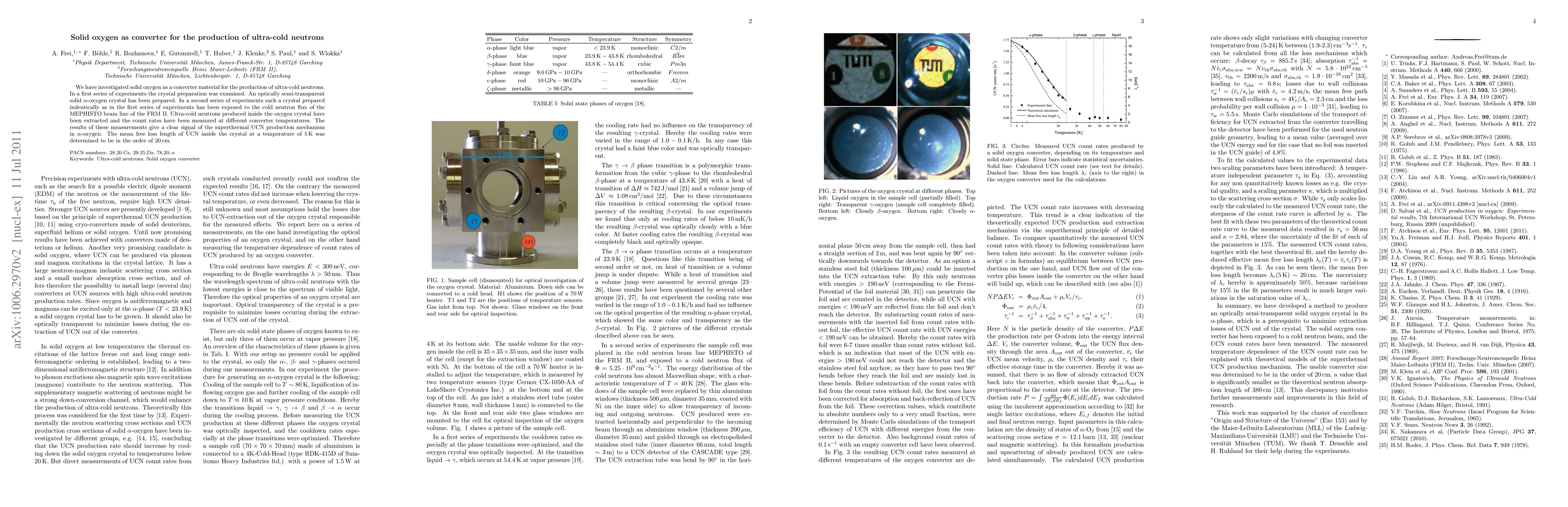 This research investigates solid oxygen as a converter for ultra-cold neutron production, demonstrating the superthermal UCN production mechanism in $\alpha$-oxygen crystals. Experiments show a mean free loss length of UCN inside the crystal at 5 K to be around 20 cm.