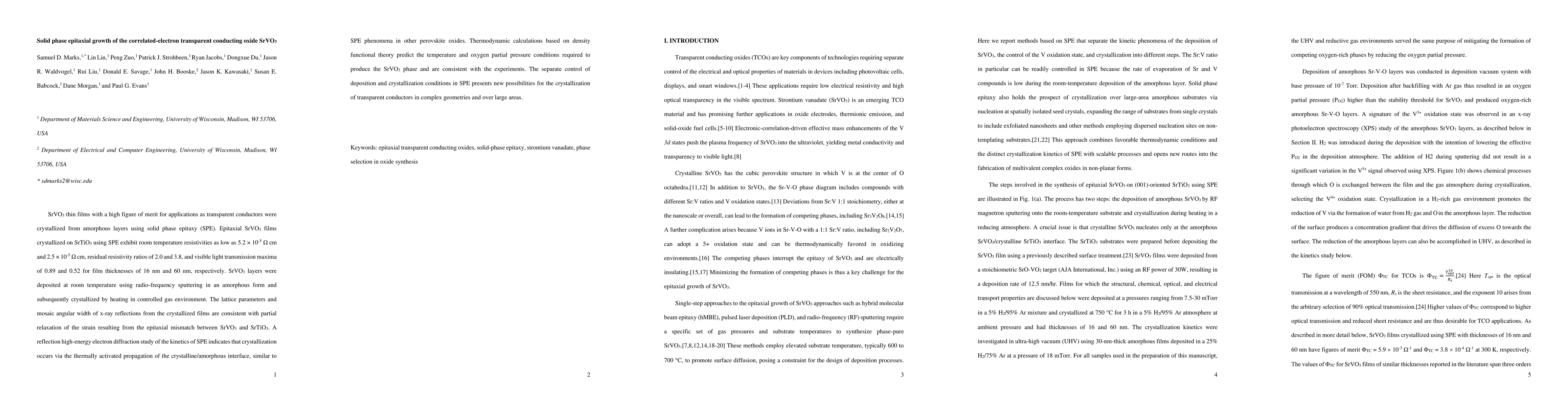 SrVO3 thin films were crystallized from amorphous layers using solid phase epitaxy (SPE) to achieve high transparency and low resistivity for transparent conducting applications. The epitaxial films on SrTiO3 substrates show promising electrical and optical properties, indicating potential for large-area transparent conductor applications.