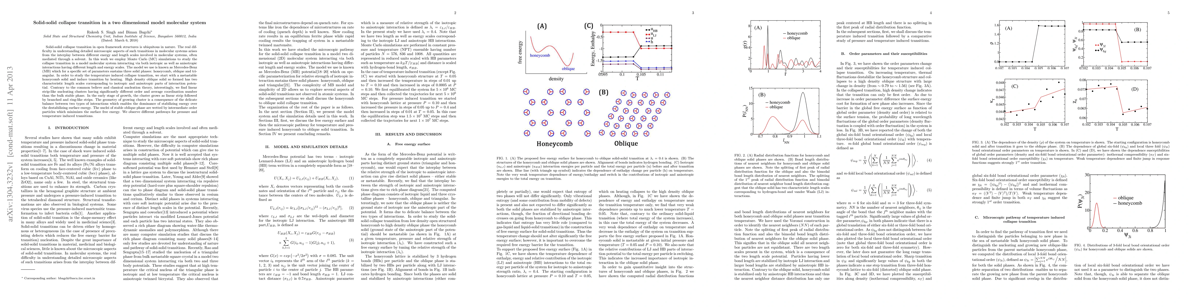 This paper uses Monte Carlo simulations to study the solid-solid collapse transition in a two-dimensional model molecular system known as Mercedes-Benz (MB), revealing linear strip-like nucleating clusters during the transition, contrary to classical nucleation theory. The study highlights different pathways for pressure and temperature-induced transitions, emphasizing the balance between isotropic and anisotropic interactions.