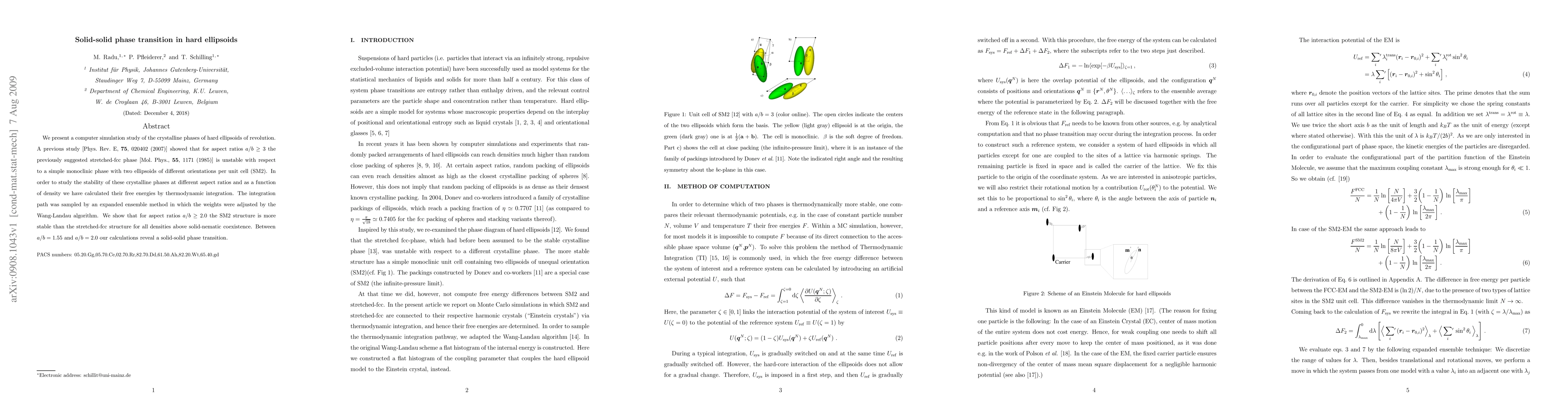 Researchers found a solid-solid phase transition in hard ellipsoids of revolution for aspect ratios between 1.55 and 2.0, with the monoclinic SM2 structure being more stable than the stretched-fcc structure at higher densities.