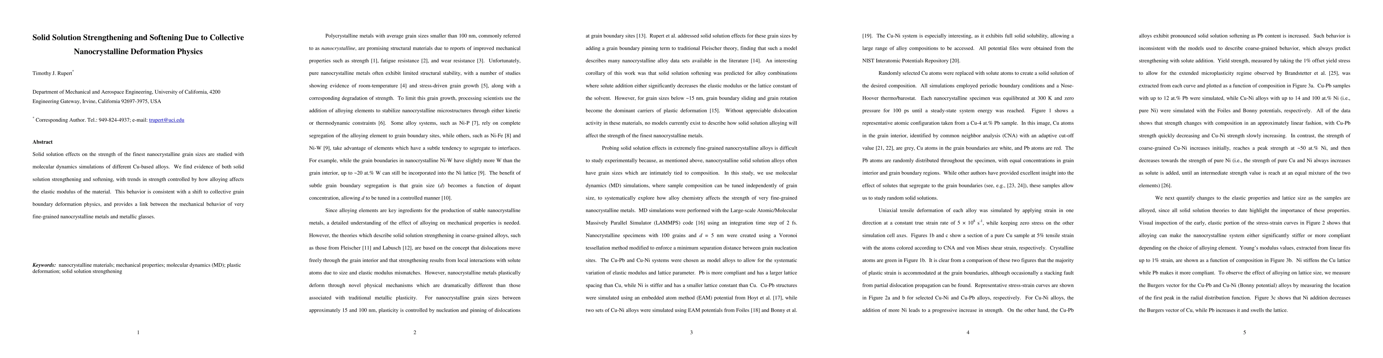 Summary: Molecular dynamics simulations reveal solid solution strengthening and softening in nanocrystalline Cu-based alloys, with strength trends influenced by alloy-induced changes in elastic modulus, indicating a shift to collective grain boundary deformation mechanisms. This behavior connects the mechanical properties of fine-grained nanocrystalline metals to those of metallic glasses.