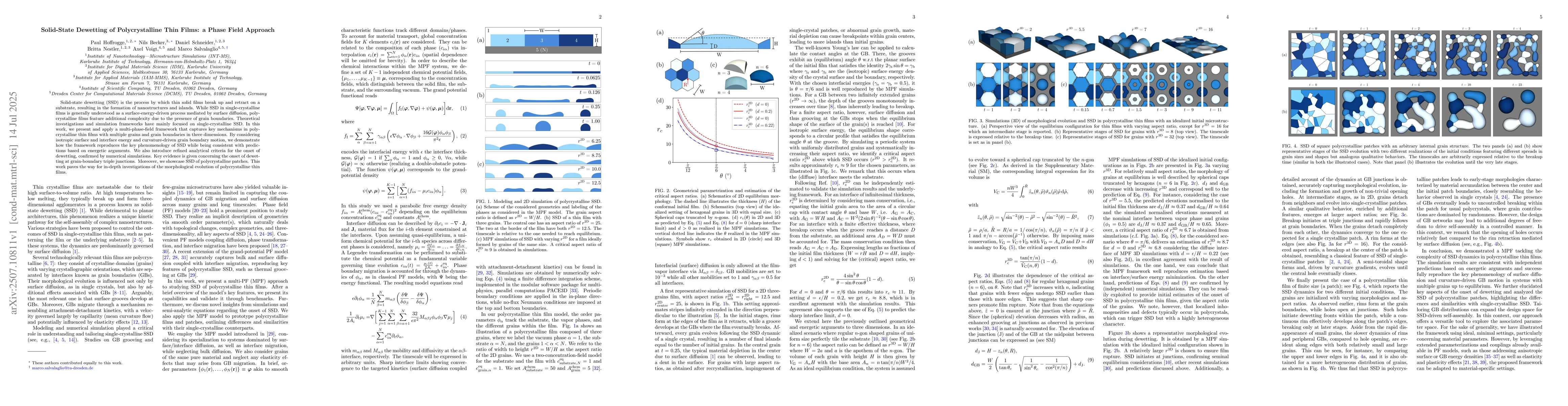 Solid-state dewetting (SSD) is the process by which thin solid films break up and retract on a substrate, resulting in the formation of nanostructures and islands. While SSD in single-crystalline films is generally understood as a surface-energy-driven process mediated by surface diffusion, polycrystalline films feature additional complexity due to the presence of grain boundaries. Theoretical investigations and simulation frameworks have mainly focused on single-crystalline SSD. In this work, we present and apply a multi-phase-field framework that captures key mechanisms in polycrystalline thin films with multiple grains and grain boundaries in three dimensions. By considering isotropic surface and interface energy and curvature-driven grain boundary motion, we demonstrate how the framework reproduces the key phenomenology of SSD while being consistent with predictions based on energetic arguments. We also introduce refined analytical criteria for the onset of dewetting, confirmed by numerical simulations. Key evidence is given concerning the onset of dewetting at grain-boundary triple junctions. Moreover, we showcase SSD of polycrystalline patches. This work paves the way for in-depth investigations of the morphological evolution of polycrystalline thin films.