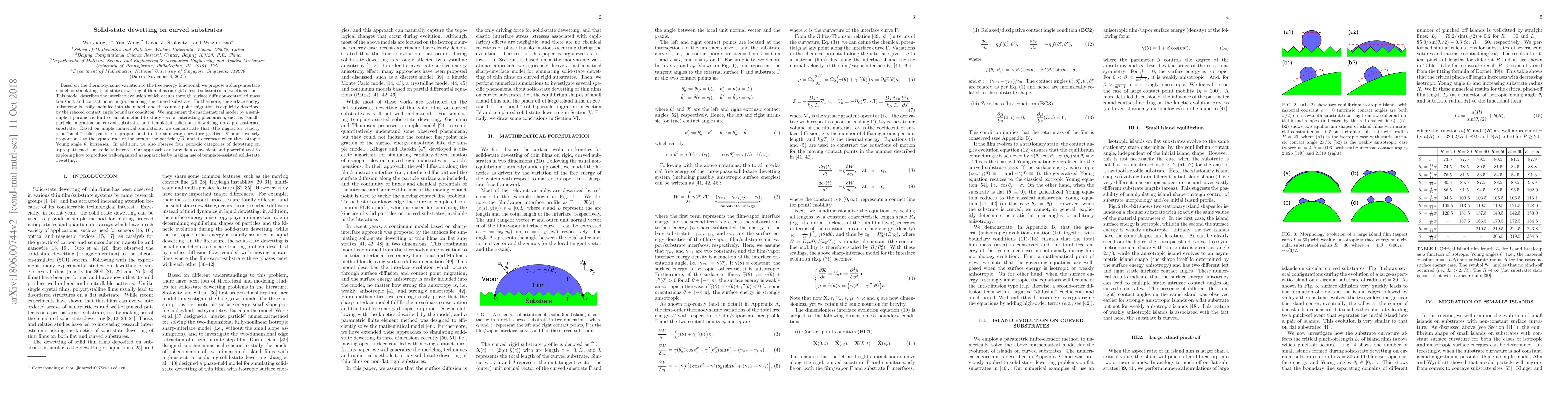 This paper proposes a sharp-interface model to simulate solid-state dewetting on curved substrates, incorporating surface diffusion and contact point migration. It demonstrates particle migration influenced by substrate curvature and dewetting patterns on pre-patterned substrates, offering insights into template-assisted nanoparticle formation.
