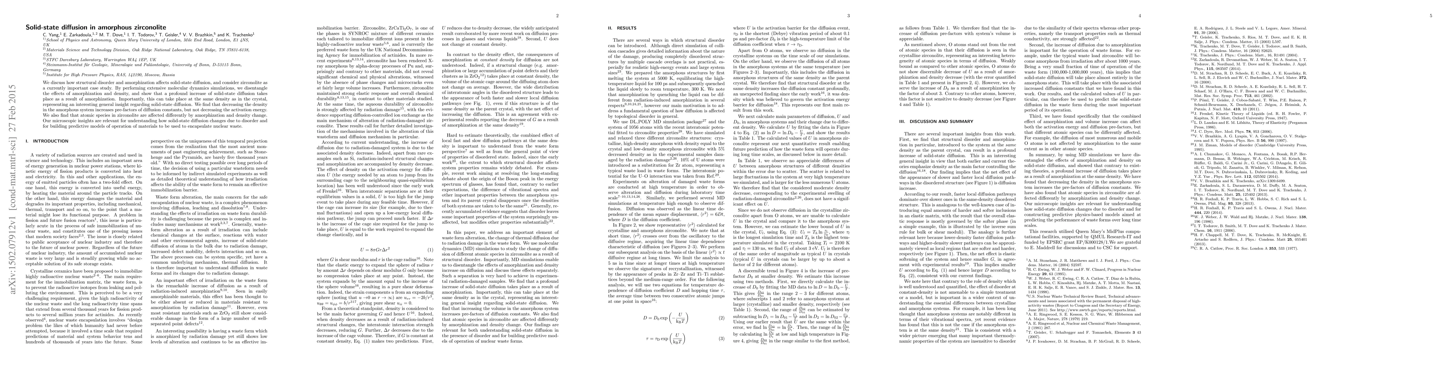 This paper investigates how structural disorder and amorphization influence solid-state diffusion using zirconolite as a case study. Molecular dynamics simulations reveal that amorphization significantly enhances diffusion at the same density as the crystal, while density reduction in the amorphous state increases diffusion pre-factors without affecting activation energy.