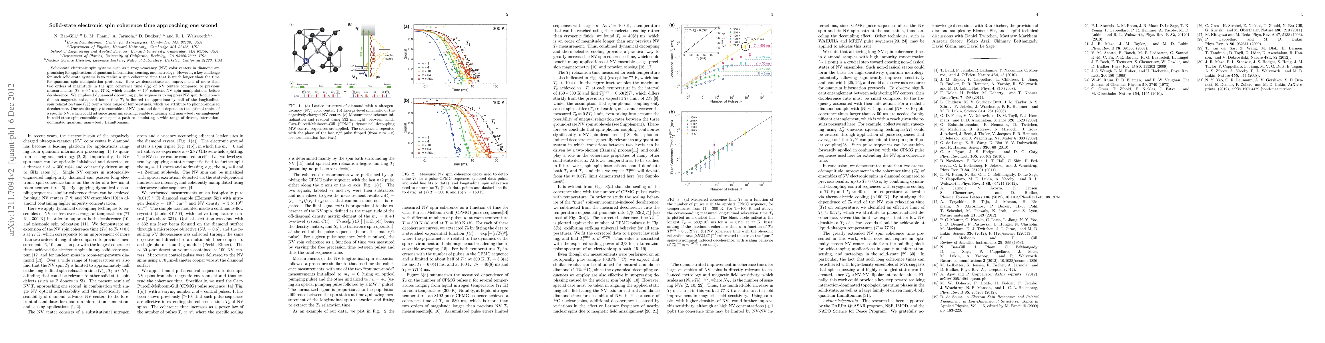 This paper reports a significant enhancement in the spin coherence time of nitrogen-vacancy (NV) centers in diamond to approximately 0.5 seconds at 77 K, achieved through dynamical decoupling techniques. This improvement could greatly advance quantum sensing and enable complex quantum phenomena in solid-state systems.