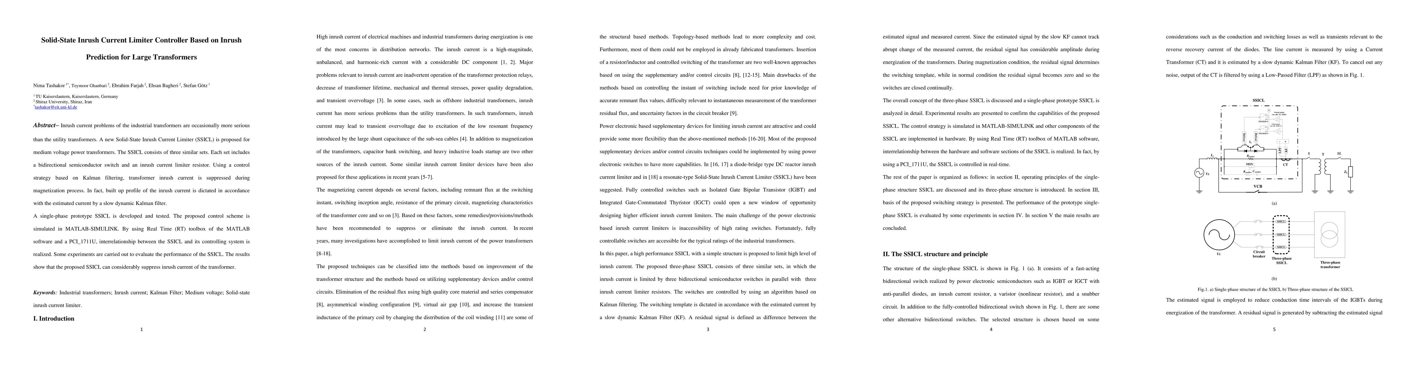 Inrush current problems of the industrial transformers are occasionally more serious than the utility transformers. A new Solid-State Inrush Current Limiter (SSICL) is proposed for medium voltage power transformers. The SSICL consists of three similar sets. Each set includes a bidirectional semiconductor switch and an inrush current limiter resistor. Using a control strategy based on Kalman filtering, transformer inrush current is suppressed during magnetization process. In fact, built up profile of the inrush current is dictated in accordance with the estimated current by a slow dynamic Kalman filter. A single-phase prototype SSICL is developed and tested. The proposed control scheme is simulated in MATLAB-SIMULINK. By using Real Time (RT) toolbox of the MATLAB software and a PCI_1711U, interrelationship between the SSICL and its controlling system is realized. Some experiments are carried out to evaluate the performance of the SSICL. The results show that the proposed SSICL can considerably suppress inrush current of the transformer