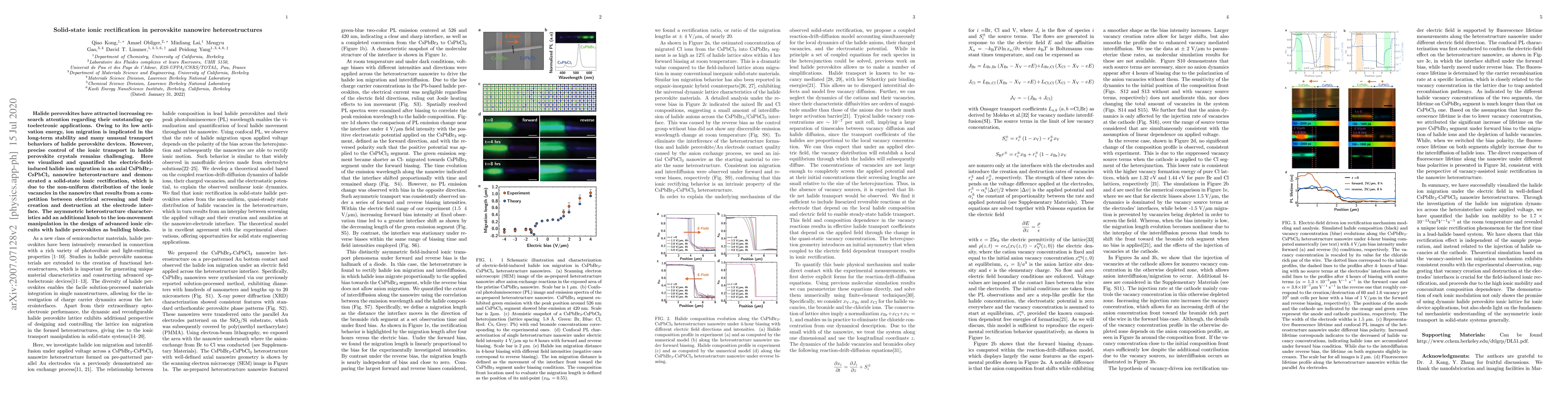 This paper investigates electric-field-induced halide ion migration in CsPbBr$_3$-CsPbCl$_3$ perovskite nanowire heterostructures, demonstrating solid-state ionic rectification due to non-uniform ionic vacancy distribution. The asymmetric heterostructure provides a new method for controlling ion movement in advanced ionic circuits.