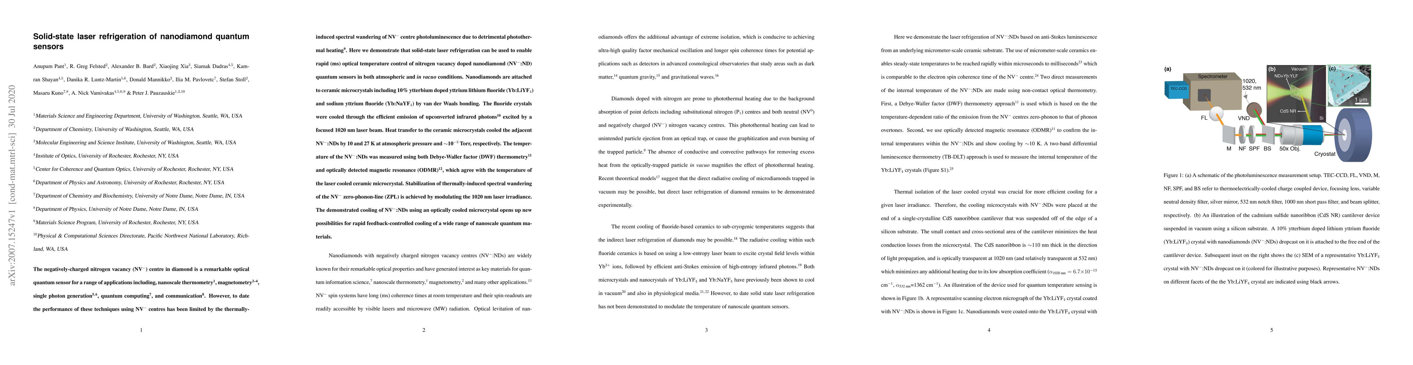 This paper demonstrates solid-state laser refrigeration to rapidly control the temperature of NV$^-$ centre-doped nanodiamond quantum sensors, achieving cooling of up to 27 K in vacuum. The method uses upconverted infrared photons from cooled ceramic microcrystals to stabilize the sensors' spectral properties.