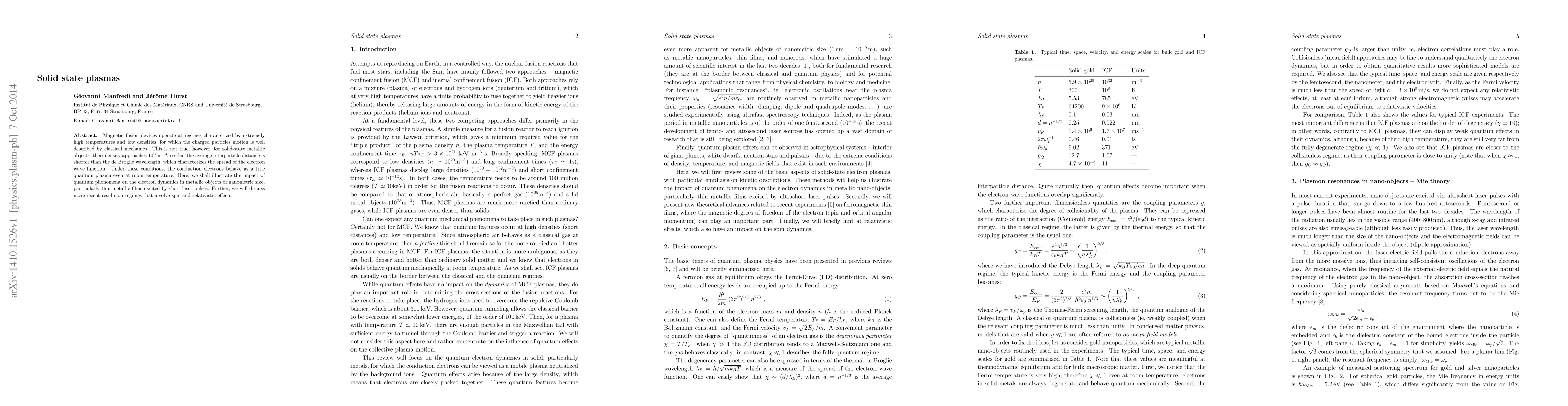 Magnetic fusion devices operate at regimes characterized by extremely high temperatures and low densities, for which the charged particles motion is well described by classical mechanics. This is not true, however, for solid-state metallic objects: their density approaches $10^{28} \rm m^{-3}$, so that the average interparticle distance is shorter than the de Broglie wavelength, which characterizes the spread of the electron wave function. Under these conditions, the conduction electrons behave as a true quantum plasma even at room temperature. Here, we shall illustrate the impact of quantum phenomena on the electron dynamics in metallic objects of nanometric size, particularly thin metallic films excited by short laser pulses. Further, we will discuss more recent results on regimes that involve spin and relativistic effects.