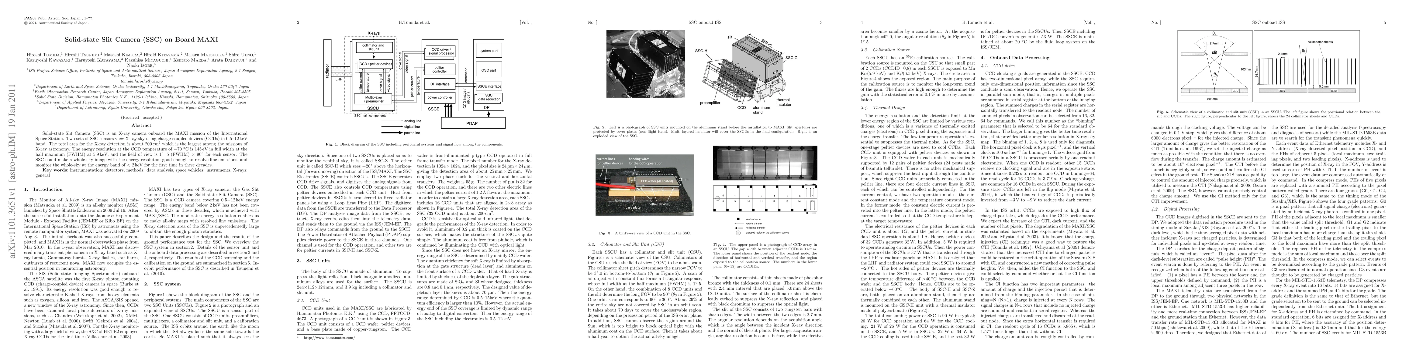 Solid-state Slit Camera (SSC) is an X-ray camera onboard the MAXI mission of the International Space Station. Two sets of SSC sensors view X-ray sky using charge-coupled devices (CCDs) in 0.5--12\,keV band. The total area for the X-ray detection is about 200\,cm$\rm ^2$ which is the largest among the missions of X-ray astronomy. The energy resolution at the CCD temperature of $-$70 \degc is 145\,eV in full width at the half maximum (FWHM) at 5.9\,keV, and the field of view is 1\deg .5 (FWHM) $\times$ 90\deg for each sensor. The SSC could make a whole-sky image with the energy resolution good enough to resolve line emissions, and monitor the whole-sky at the energy band of $<$ 2\,keV for the first time in these decades.