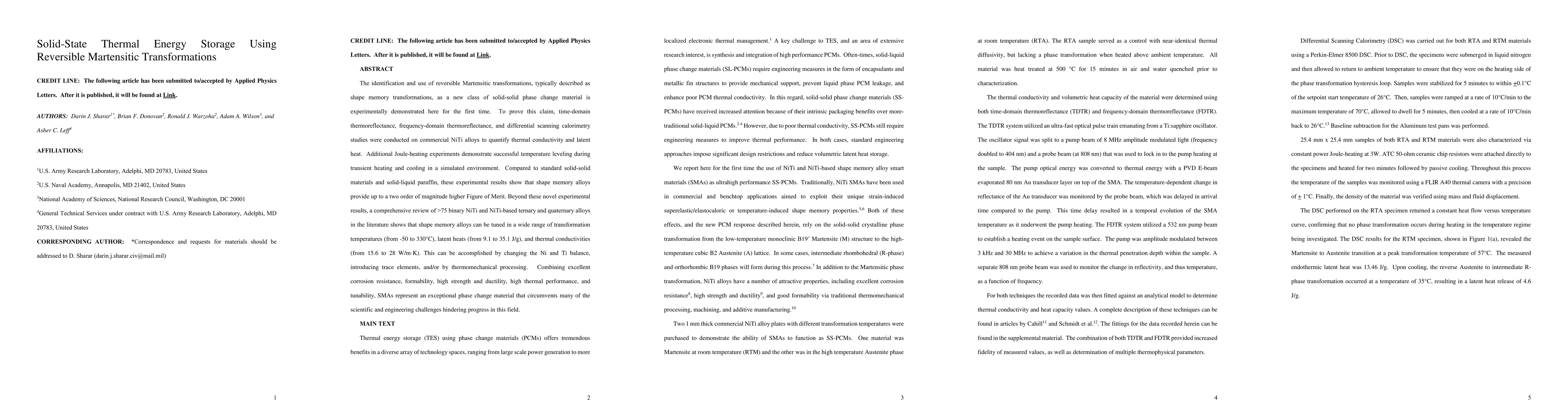 This paper demonstrates the novel use of reversible martensitic transformations in NiTi shape memory alloys for solid-state thermal energy storage, showcasing their significantly higher Figure of Merit compared to standard materials. The study highlights the tunability of these alloys in terms of transformation temperatures, latent heat, and thermal conductivity, making them a promising material for thermal energy storage applications.
