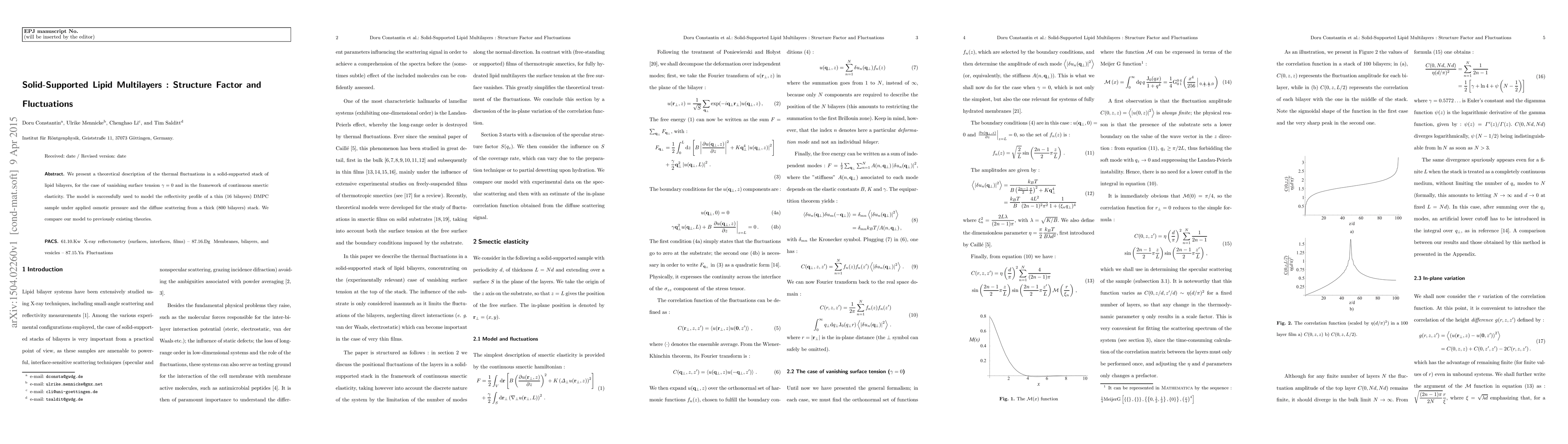 This paper theoretically describes thermal fluctuations in solid-supported lipid multilayers, modeling their reflectivity and scattering profiles under osmotic pressure. The study compares its continuous smectic elasticity model to existing theories.