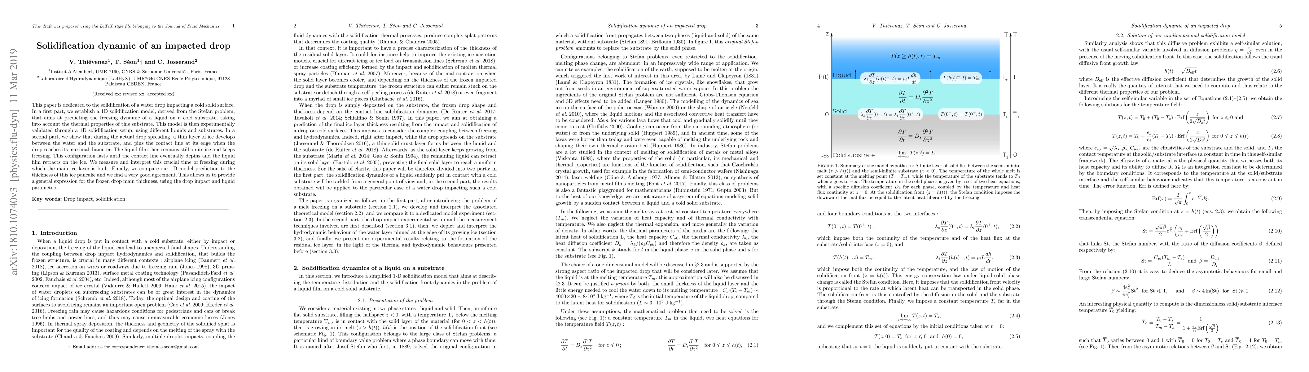 The paper presents a simplified 1D model for solidification dynamics, characterizing the effective diffusion front and providing an expression for the ice pancake thickness.