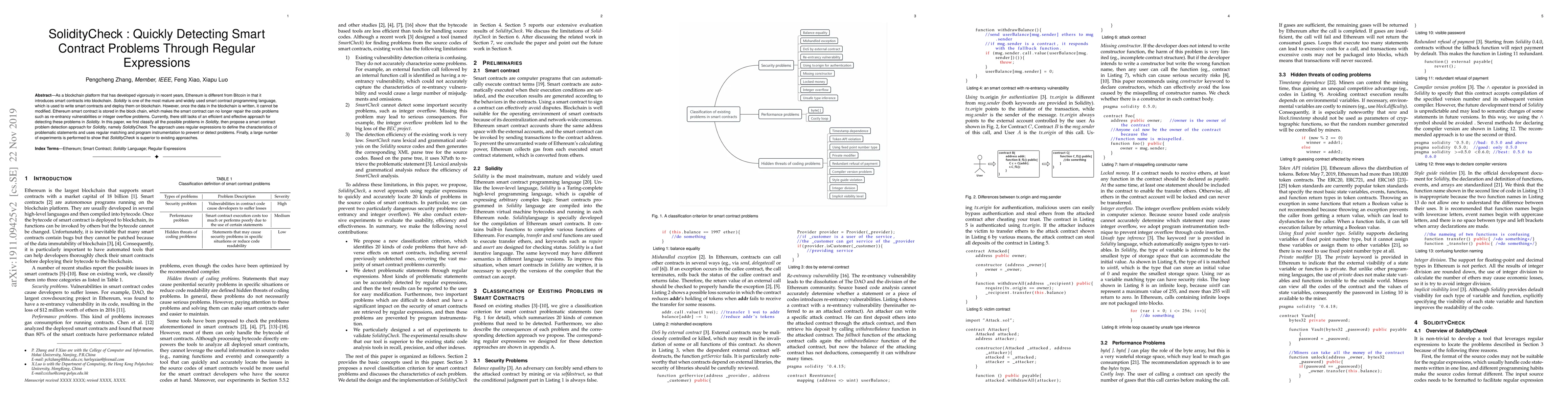 This paper introduces SolidityCheck, a method for detecting problems in Solidity smart contracts using regular expressions to identify problematic patterns. Experiments demonstrate that SolidityCheck outperforms existing detection approaches in identifying issues like re-entrancy vulnerabilities and integer overflows.