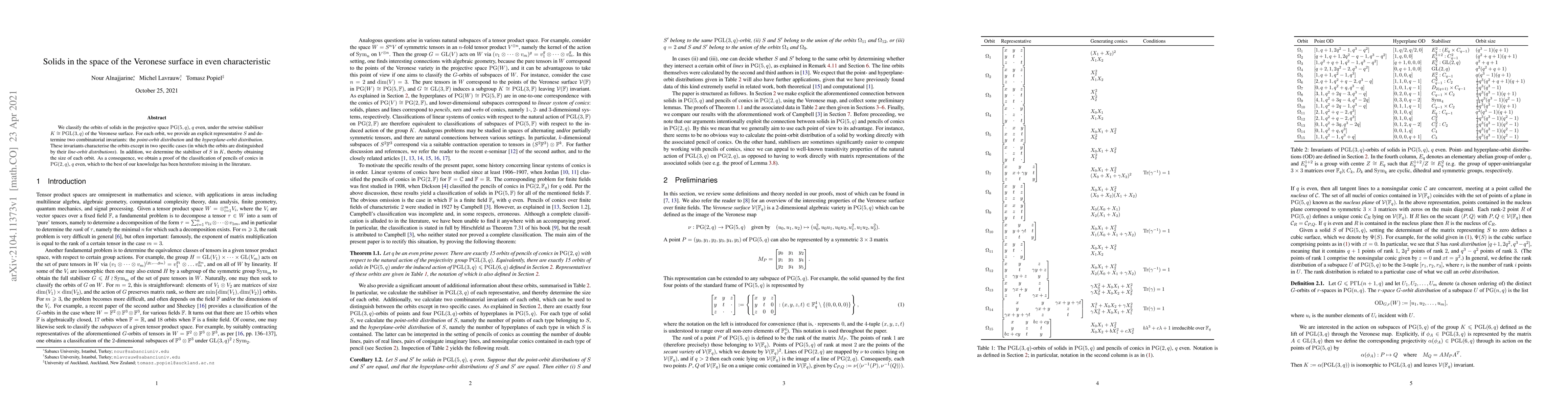 We classify the orbits of solids in the projective space $\text{PG}(5,q)$, $q$ even, under the setwise stabiliser $K \cong \text{PGL}(3,q)$ of the Veronese surface. For each orbit, we provide an explicit representative $S$ and determine two combinatorial invariants: the point-orbit distribution and the hyperplane-orbit distribution. These invariants characterise the orbits except in two specific cases (in which the orbits are distinguished by their line-orbit distributions). In addition, we determine the stabiliser of $S$ in $K$, thereby obtaining the size of each orbit. As a consequence, we obtain a proof of the classification of pencils of conics in $\text{PG}(2,q)$, $q$ even, which to the best of our knowledge has been heretofore missing in the literature.