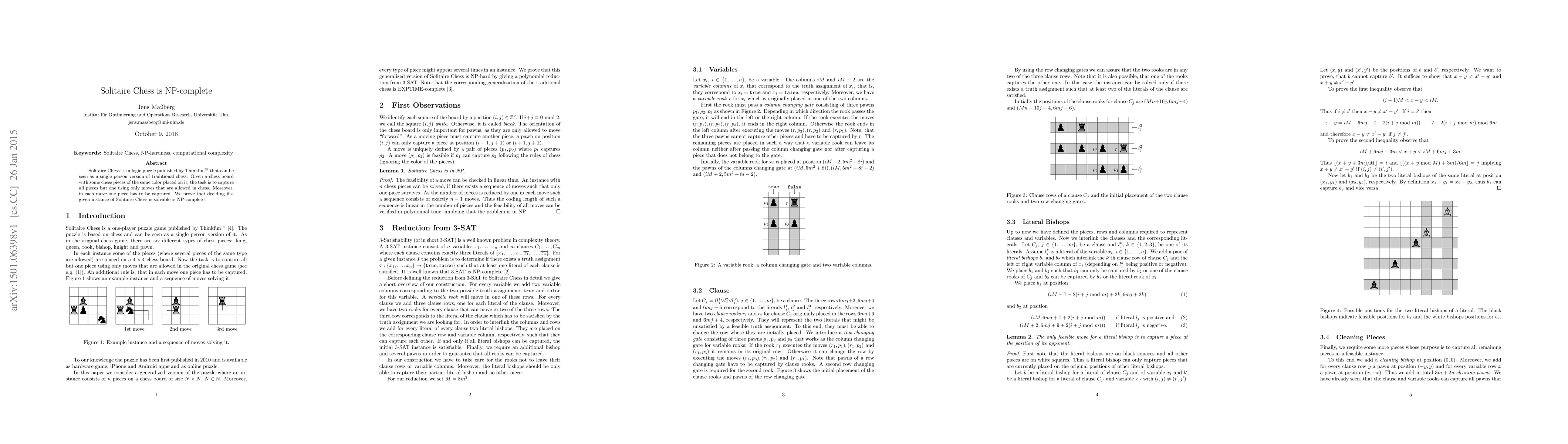 This paper proves that determining whether a given instance of Solitaire Chess, a single-player logic puzzle akin to traditional chess, is solvable is an NP-complete problem. The challenge involves capturing all but one piece on the board using valid chess moves.