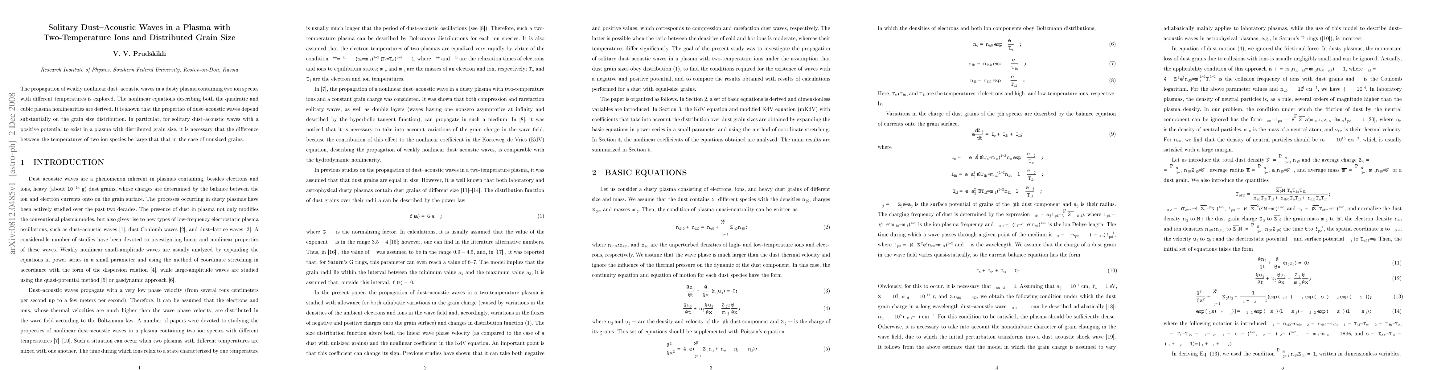 Summary: This paper investigates dust-acoustic waves in a plasma with two-temperature ion species and varying dust grain sizes, deriving nonlinear equations for quadratic and cubic plasma nonlinearities. It concludes that the existence of solitary dust-acoustic waves requires a significant temperature difference between the ion species, especially when grain size distribution is considered.
