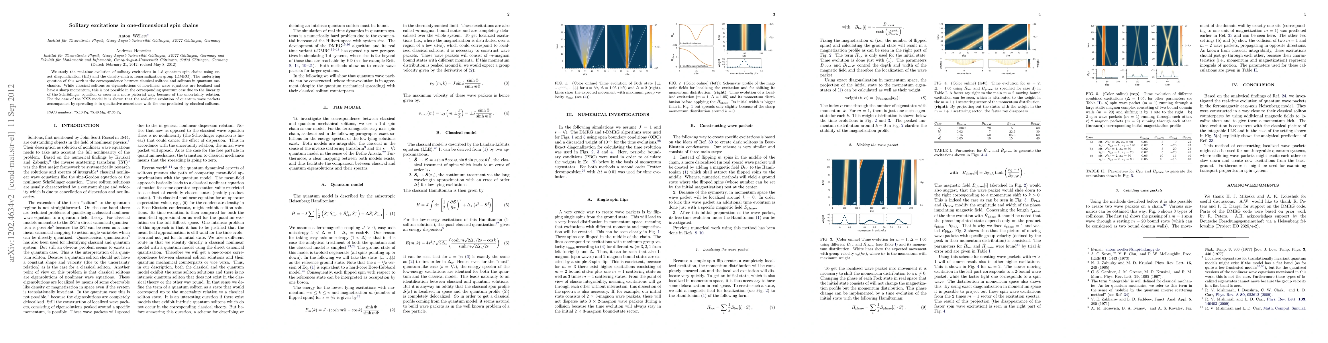 This paper investigates the real-time evolution of solitary excitations in one-dimensional quantum spin chains using exact diagonalization and DMRG methods. It explores the relationship between classical solitons and quantum solitons, demonstrating that quantum wave packets exhibit spreading similar to classical solitons, despite the inherent uncertainty in quantum mechanics.