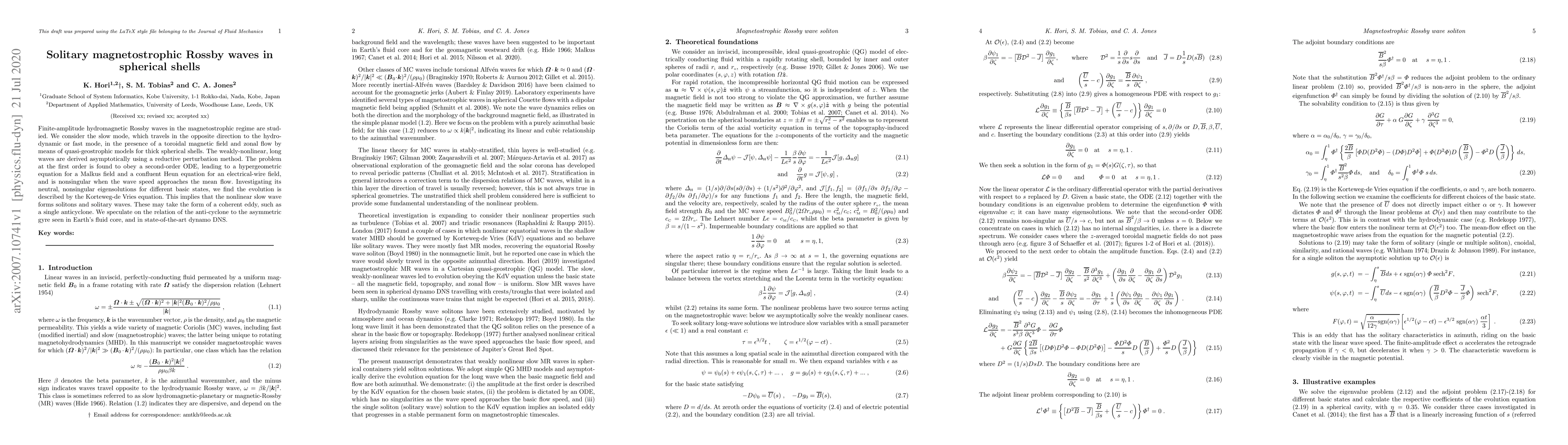 This study investigates slow magnetostrophic Rossby waves in a spherical shell, finding that they form solitons and solitary waves with specific characteristics.