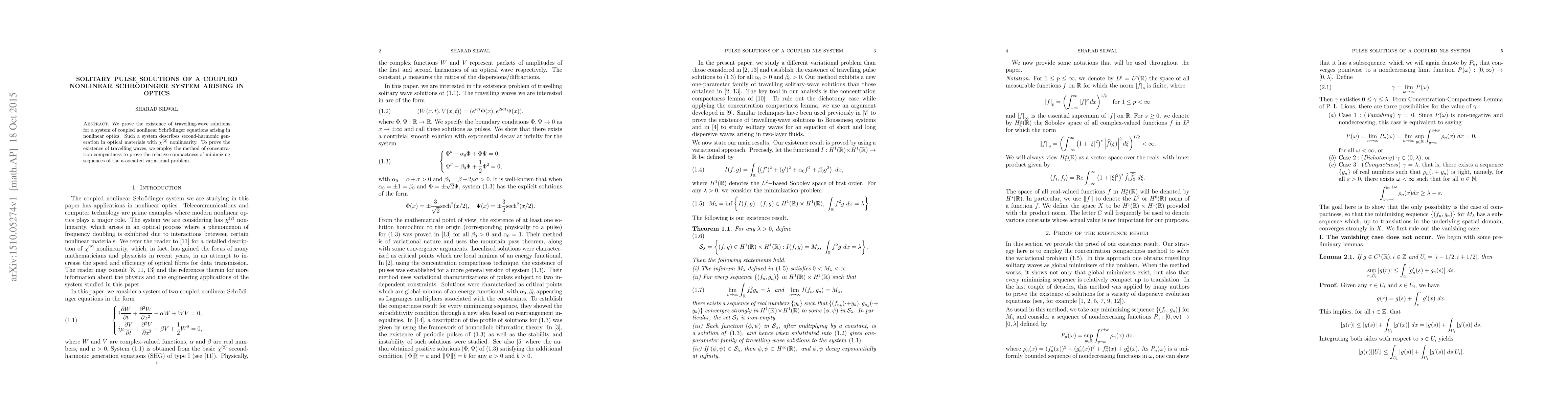 This paper proves the existence of solitary pulse solutions for a coupled nonlinear Schrödinger system relevant to second-harmonic generation in optical materials with $\chi^{(2)}$ nonlinearity. The method of concentration compactness is utilized to demonstrate the relative compactness of minimizing sequences in the associated variational problem.