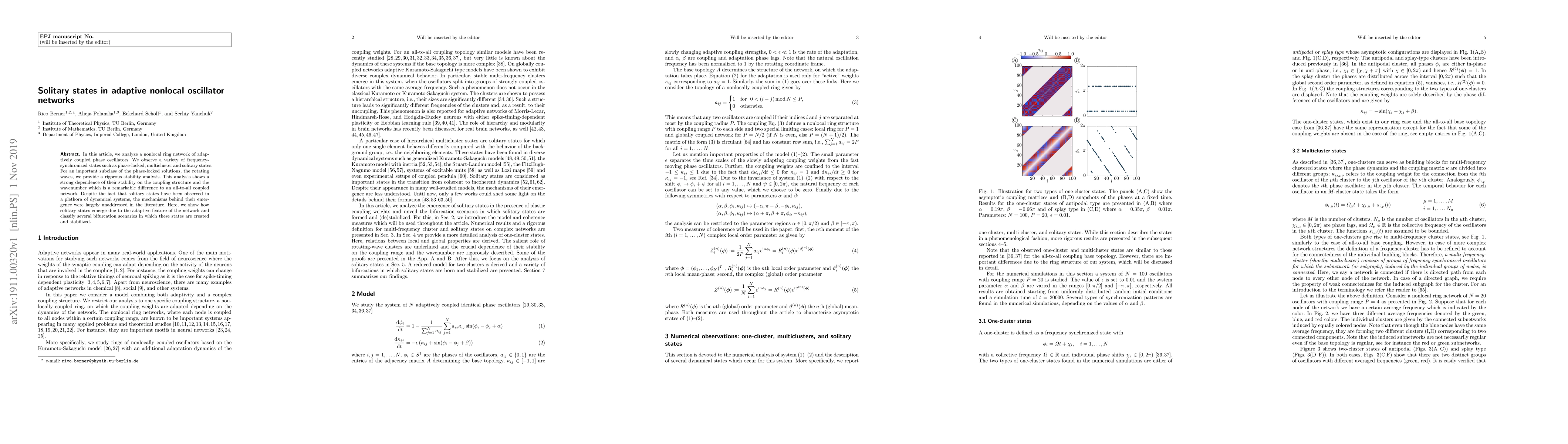 In this article, we analyze a nonlocal ring network of adaptively coupled phase oscillators. We observe a variety of frequency-synchronized states such as phase-locked, multicluster and solitary states. For an important subclass of the phase-locked solutions, the rotating waves, we provide a rigorous stability analysis. This analysis shows a strong dependence of their stability on the coupling structure and the wavenumber which is a remarkable difference to an all-to-all coupled network. Despite the fact that solitary states have been observed in a plethora of dynamical systems, the mechanisms behind their emergence were largely unaddressed in the literature. Here, we show how solitary states emerge due to the adaptive feature of the network and classify several bifurcation scenarios in which these states are created and stabilized.