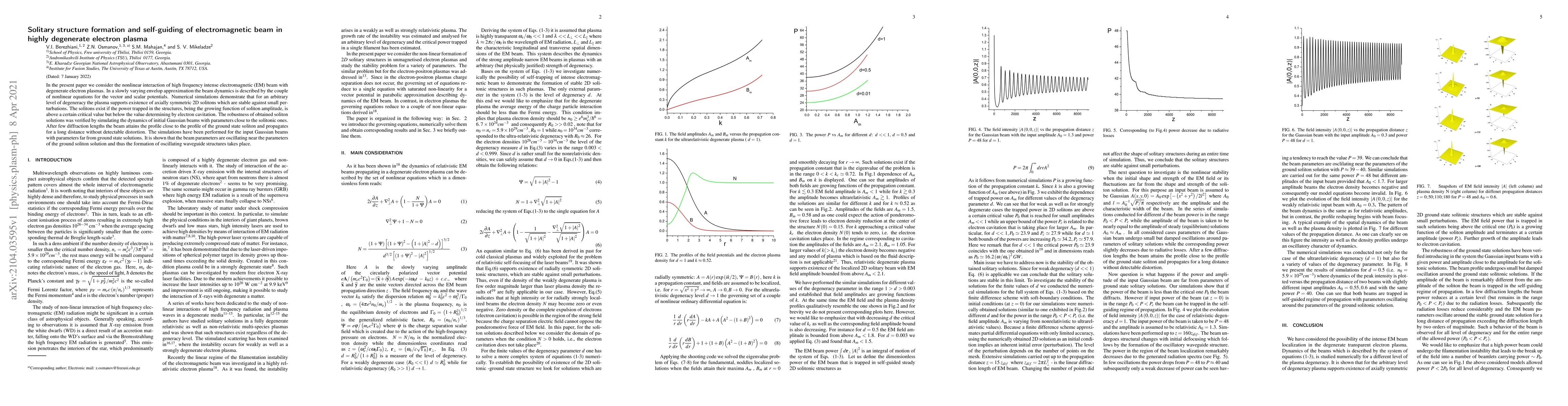 In the present paper we consider the nonlinear interaction of high frequency intense electromagnetic (EM) beam with degenerate electron plasmas. In a slowly varying envelop approximation the beam dynamics is described by the couple of nonlinear equations for the vector and scalar potentials. Numerical simulations demonstrate that for an arbitrary level of degeneracy the plasma supports existence of axially symmetric 2D solitons which are stable against small perturbations. The solitons exist if the power trapped in the structures, being the growing function of soliton amplitude, is above a certain critical value but below the value determining by electron cavitation. The robustness of obtained soliton solutions was verified by simulating the dynamics of initial Gaussian beams with parameters close to the solitonic ones. After few diffraction lengths the beam attains the profile close to the profile of the ground state soliton and propagates for a long distance without detectable distortion. The simulations have been performed for the input Gaussian beams with parameters far from ground state solutions. It is shown that the beam parameters are oscillating near the parameters of the ground soliton solution and thus the formation of oscillating waveguide structures takes place.
