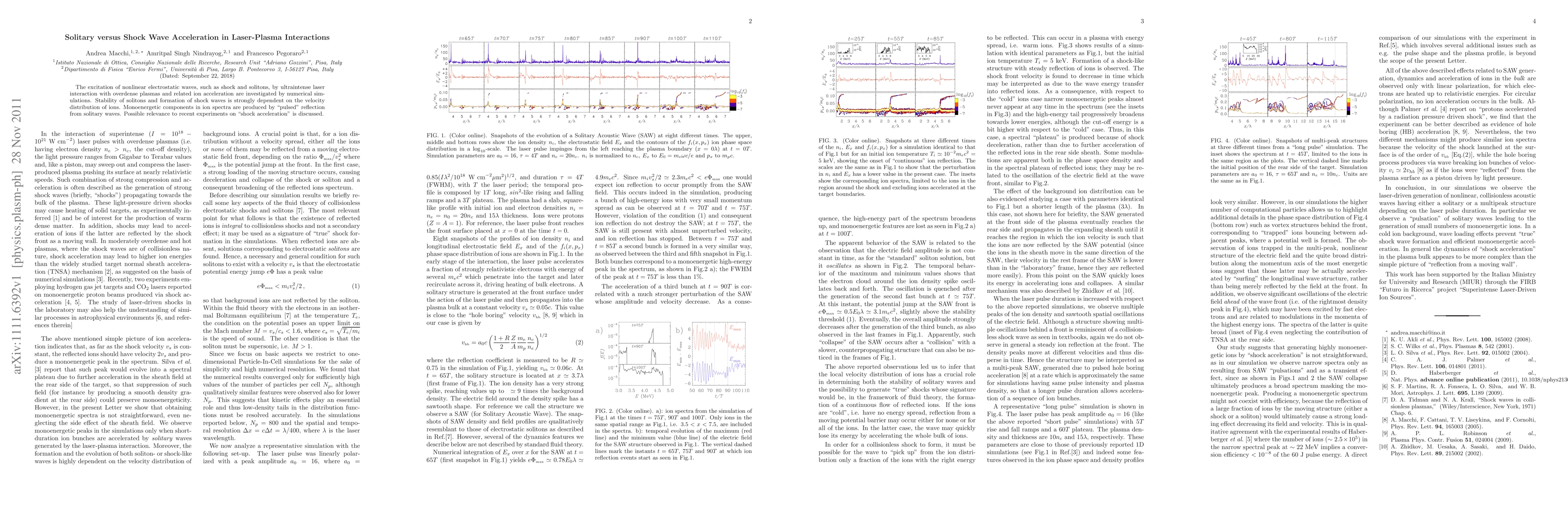 This paper investigates the ion acceleration mechanisms in laser-plasma interactions, focusing on the differences between solitary wave and shock wave excitations. Numerical simulations reveal that the stability of solitons and shock wave formation depend on the ion velocity distribution, with monoenergetic ion spectra resulting from solitary wave reflections, potentially explaining recent experimental observations of shock acceleration.