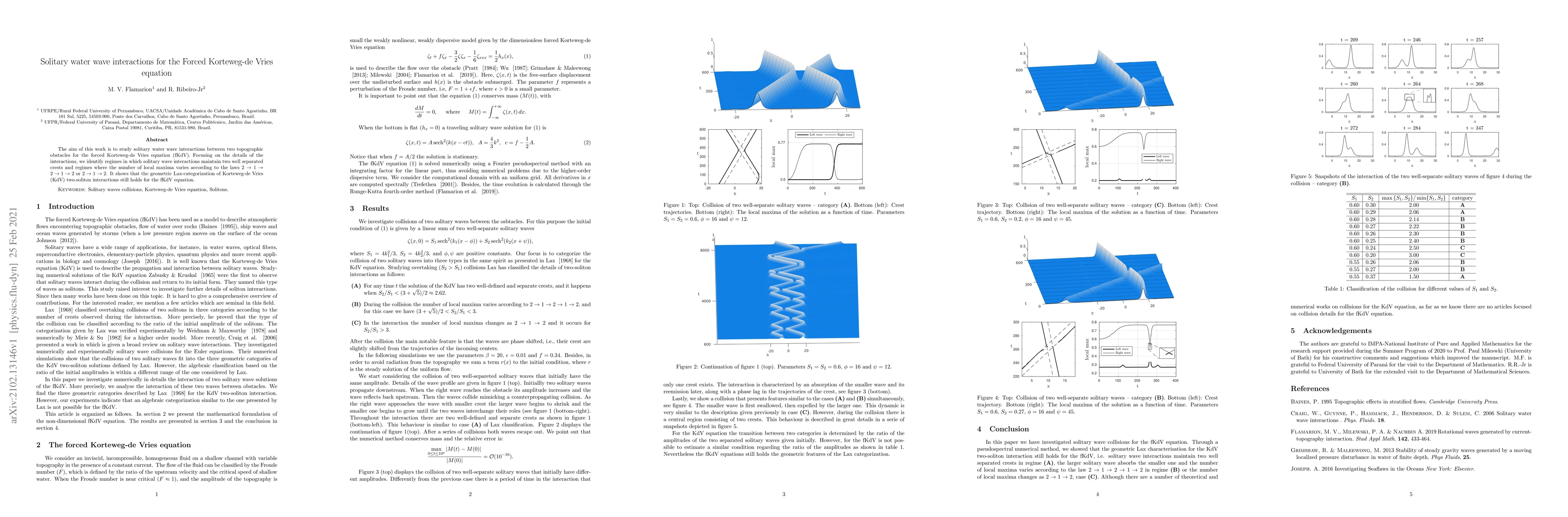 This paper investigates solitary water wave interactions governed by the forced Korteweg-de Vries equation, identifying regimes where interactions maintain two crests or alternate between two and one crests. It confirms that the geometric Lax-categorization of KdV two-soliton interactions applies to the forced variant.