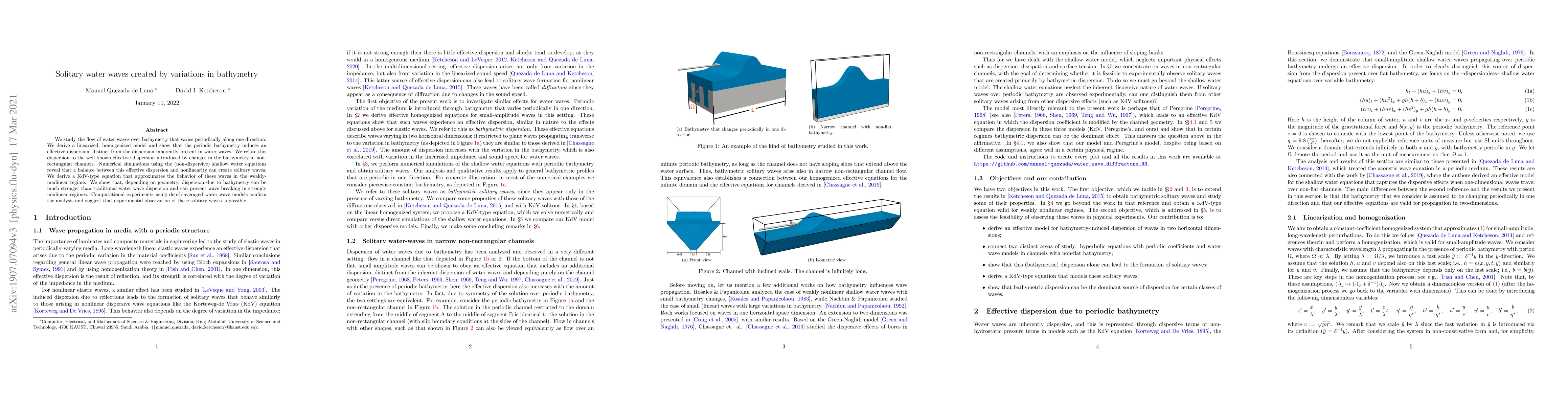 This paper investigates how periodic variations in bathymetry affect water wave dispersion, deriving a homogenized model that shows bathymetry-induced effective dispersion. Numerical simulations demonstrate that a balance between this effective dispersion and nonlinearity can generate solitary waves, with a KdV-type equation approximating their behavior.
