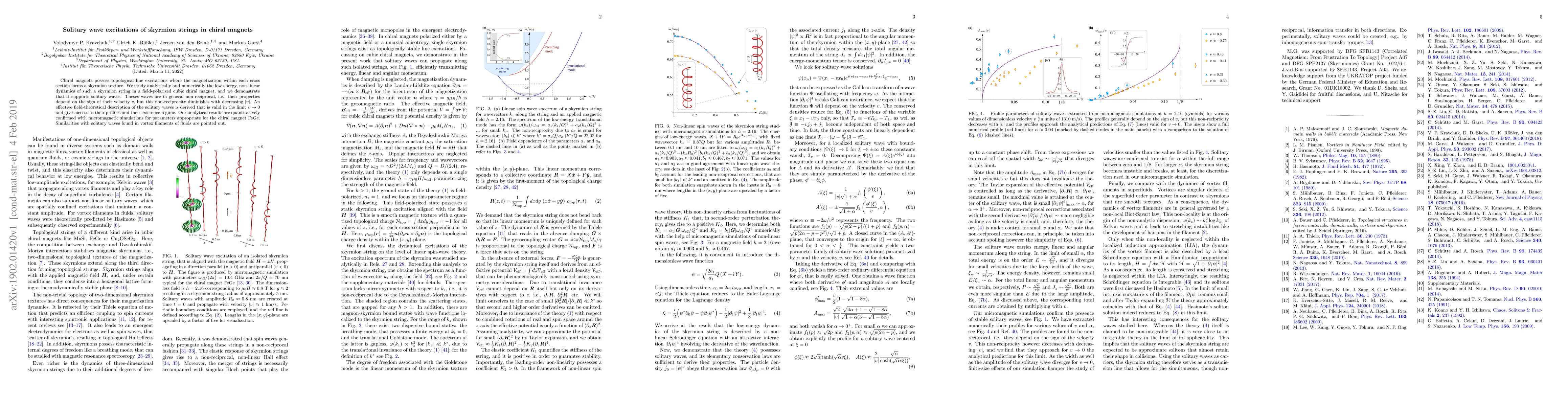 This paper investigates the low-energy dynamics of skyrmion strings in chiral magnets, showing they support non-reciprocal solitary waves whose properties depend on velocity. Analytical and numerical results reveal diminishing non-reciprocity at lower velocities, supported by simulations for FeGe.