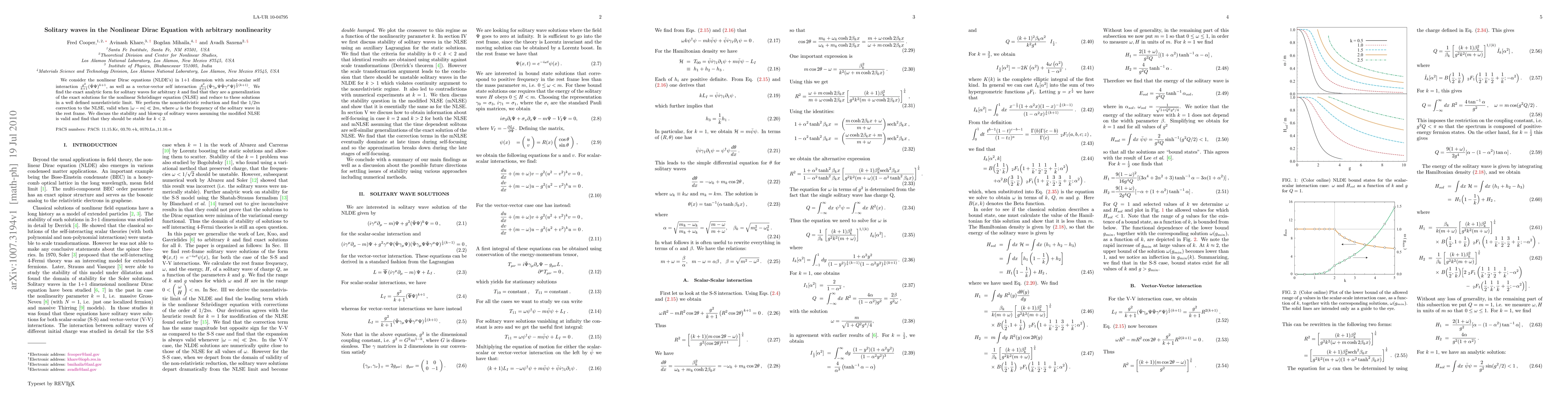 This paper investigates solitary wave solutions in the nonlinear Dirac equation with arbitrary nonlinearity, deriving exact analytic forms for these waves. It finds that these solutions generalize those of the nonlinear Schrödinger equation and are stable for specific nonlinearity parameters.