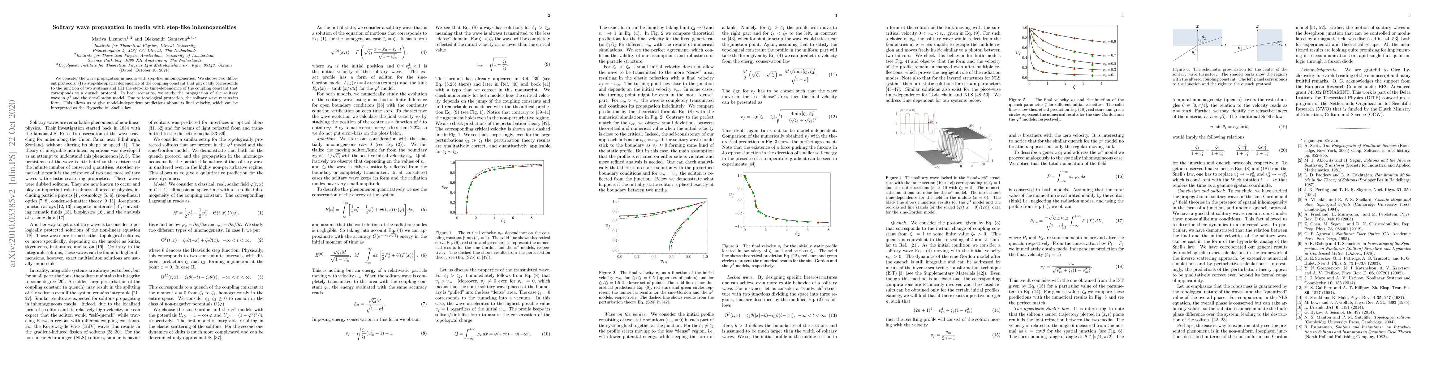 This paper investigates solitary wave propagation in media with step-like inhomogeneities, examining two protocols: spatial and temporal variations in coupling constants. The study reveals that solitary waves maintain their form due to topological protection, allowing for model-independent predictions about their final velocities.