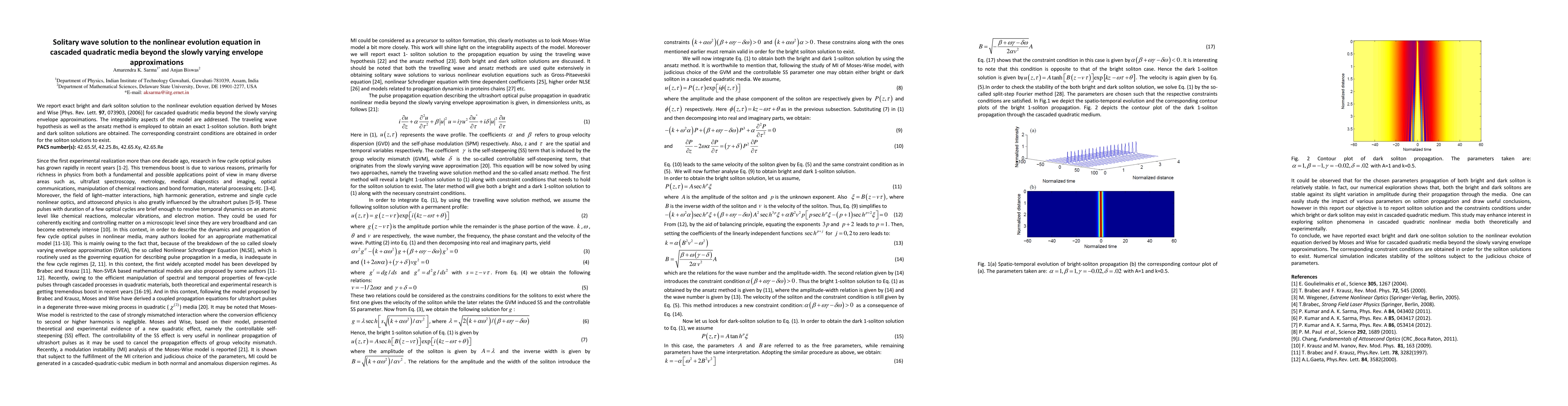 We report exact bright and dark soliton solution to the nonlinear evolution equation derived by Moses and Wise [Phys. Rev. Lett. 97, 073903, (2006)] for cascaded quadratic media beyond the slowly varying envelope approximations. The integrability aspects of the model are addressed. The traveling wave hypothesis as well as the ansatz method is employed to obtain an exact 1-soliton solution. Both bright and dark soliton solutions are obtained. The corresponding constraint conditions are obtained in order for the soliton solutions to exist.