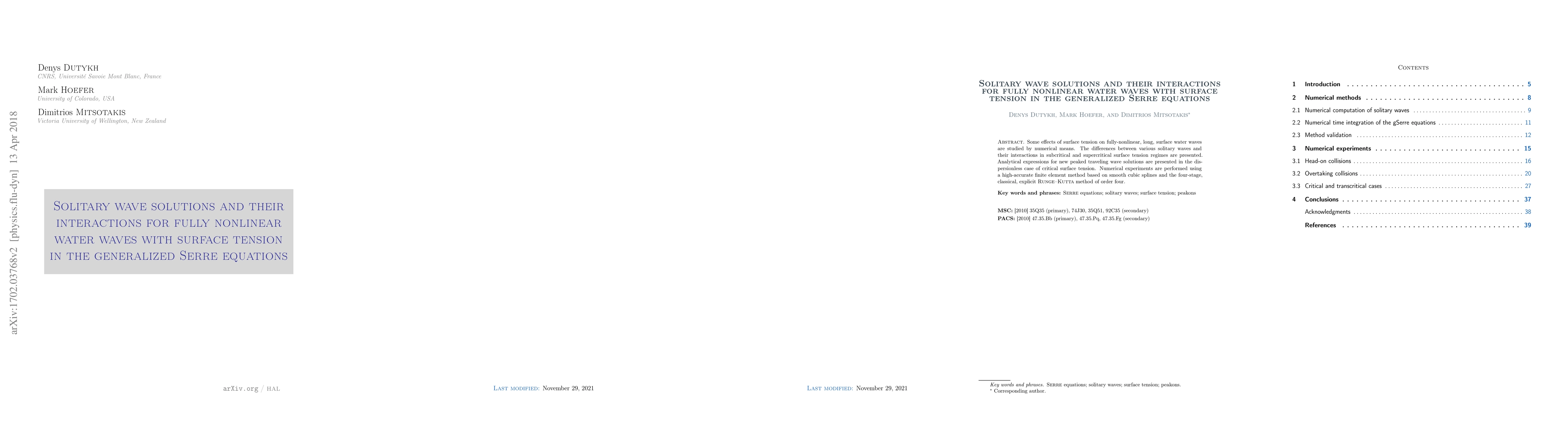 Some effects of surface tension on fully-nonlinear, long, surface water waves are studied by numerical means. The differences between various solitary waves and their interactions in subcritical and supercritical surface tension regimes are presented. Analytical expressions for new peaked travelling wave solutions are presented in the case of critical surface tension. The numerical experiments were performed using a high-accurate finite element method based on smooth cubic splines and the four-stage, classical, explicit Runge-Kutta method of order four.