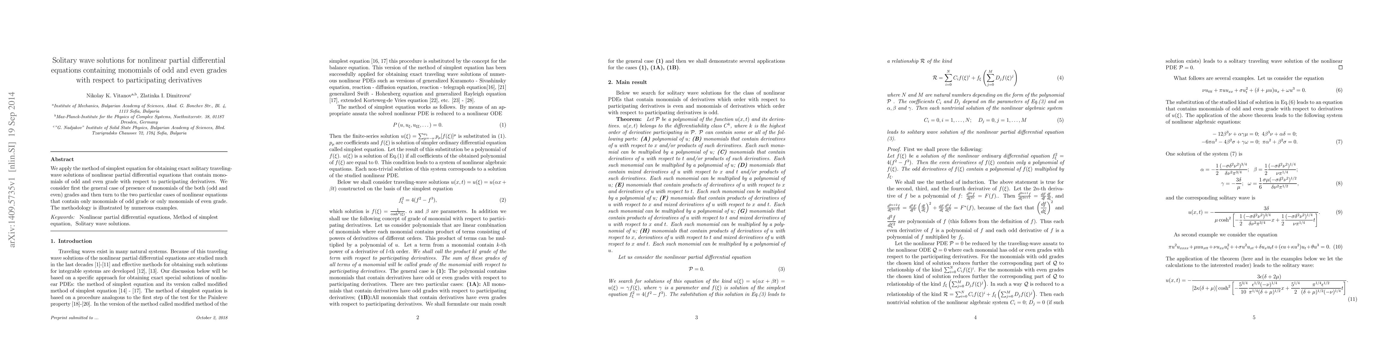 This paper presents a method using the simplest equation to find exact solutions for solitary traveling-wave nonlinear partial differential equations containing monomials of both odd and even grades. The approach is demonstrated through various examples, including specific cases with only odd or even grade monomials.
