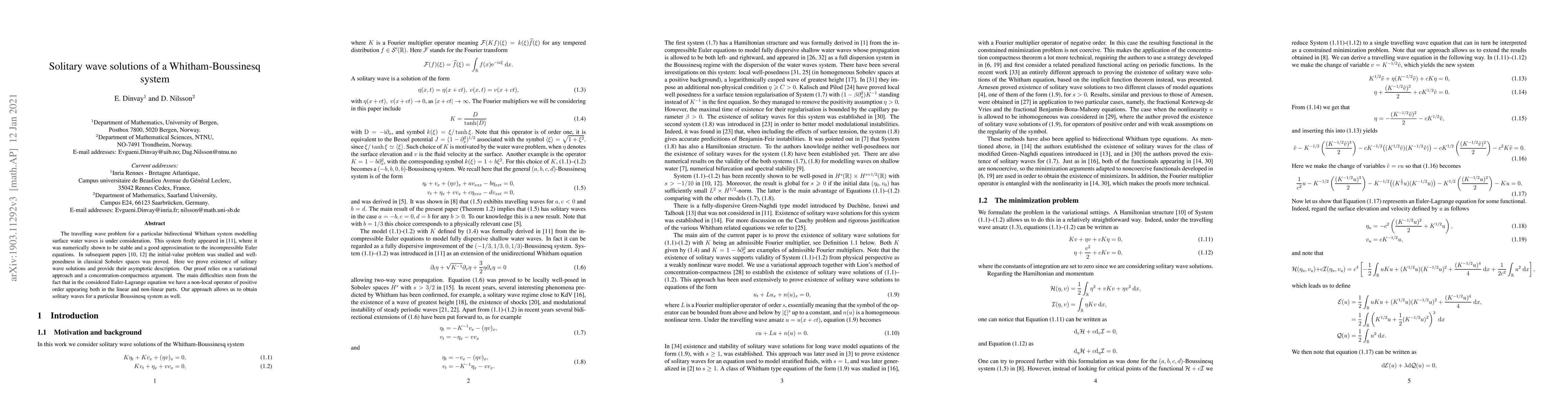 The travelling wave problem for a particular bidirectional Whitham system modelling surface water waves is under consideration. This system firstly appeared in [Dinvay, Dutykh, Kalisch 2018], where it was numerically shown to be stable and a good approximation to the incompressible Euler equations. In subsequent papers [Dinvay 2018], [Dinvay, Selberg, Tesfahun 2019] the initial-value problem was studied and well-posedness in classical Sobolev spaces was proved. Here we prove existence of solitary wave solutions and provide their asymptotic description. Our proof relies on a variational approach and a concentration-compactness argument. The main difficulties stem from the fact that in the considered Euler-Lagrange equation we have a non-local operator of positive order appearing both in the linear and non-linear parts. Our approach allows us to obtain solitary waves for a particular Boussinesq system as well.