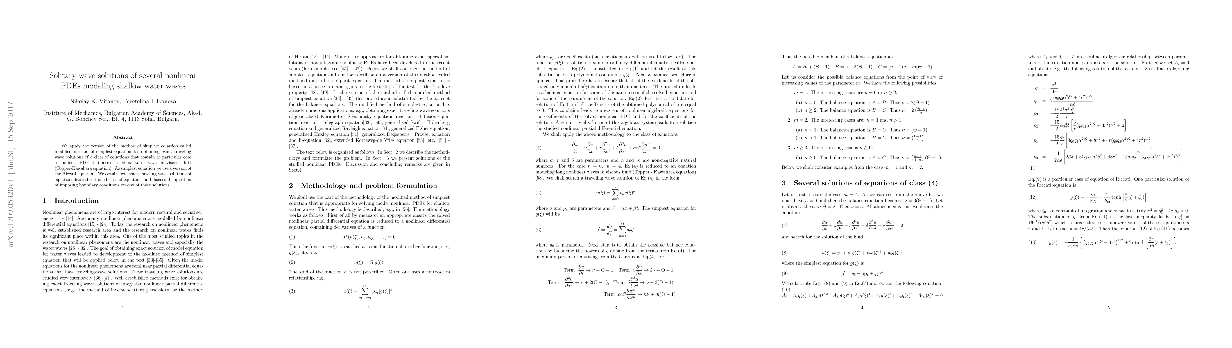 This paper utilizes the modified method of simplest equation to find exact traveling wave solutions for a class of nonlinear PDEs, including the Topper-Kawahara equation modeling shallow water waves in viscous fluids. Two exact solutions are derived, and the paper discusses the implications of applying boundary conditions to one of these solutions.