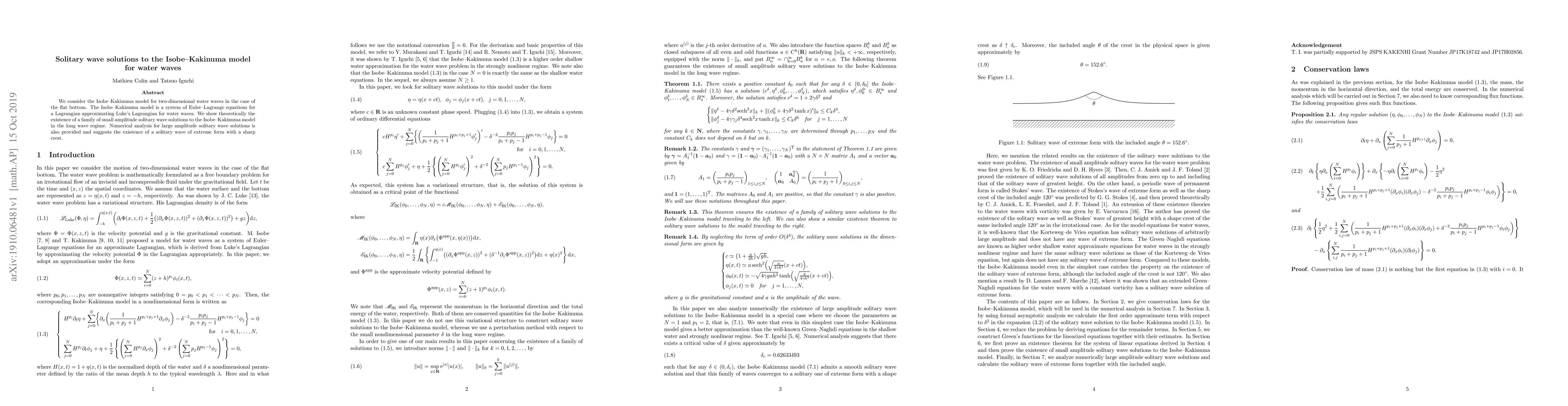 This paper demonstrates the theoretical existence of small amplitude solitary wave solutions to the Isobe-Kakinuma model for two-dimensional water waves over a flat bottom, and presents numerical analysis indicating the potential for large amplitude solitary waves with sharp crests.