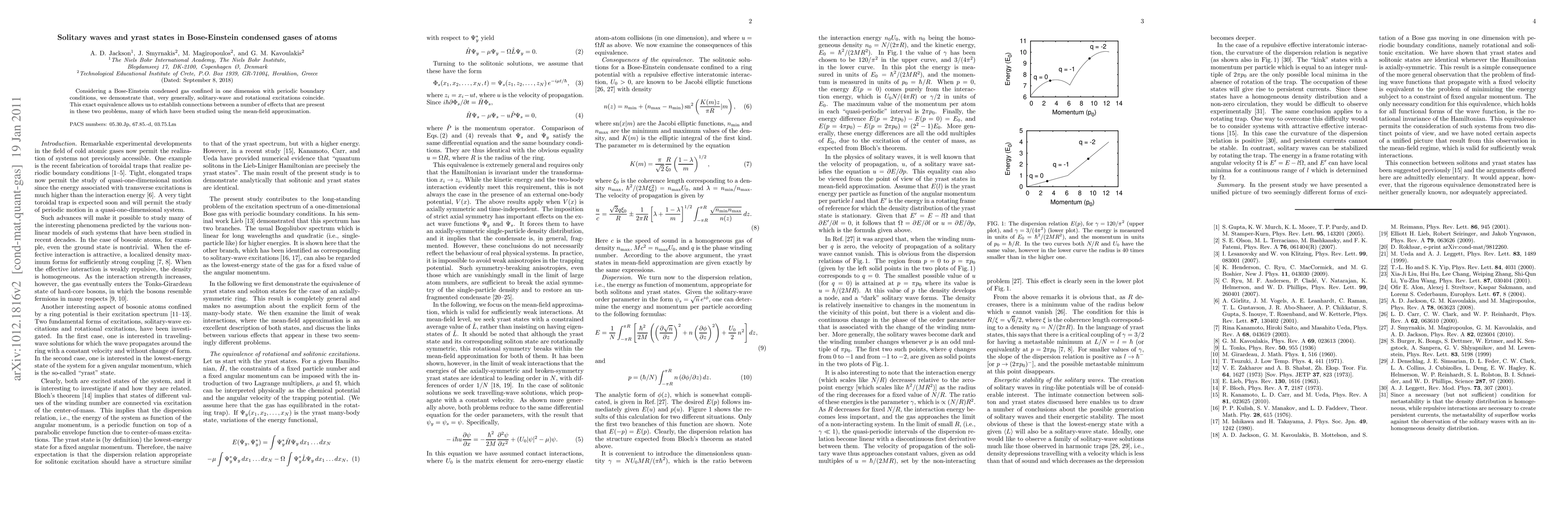 Considering a Bose-Einstein condensed gas confined in one dimension with periodic boundary conditions, we demonstrate that, very generally, solitary-wave and rotational excitations coincide. This exact equivalence allows us to establish connections between a number of effects that are present in these two problems, many of which have been studied using the mean-field approximation.