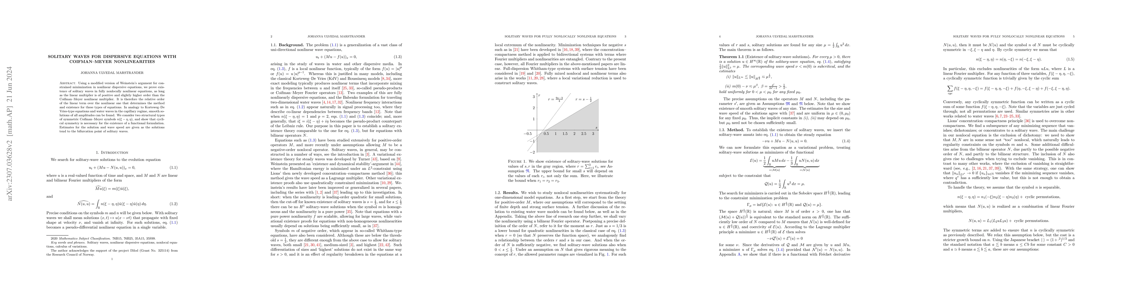 This paper proves the existence of solitary waves in fully nonlocally nonlinear dispersive equations through a modified minimization argument, focusing on the relative order between linear and Coifman-Meyer nonlinear terms. Smooth solutions of all amplitudes are shown to exist, with cyclical symmetry required for functional formulation.