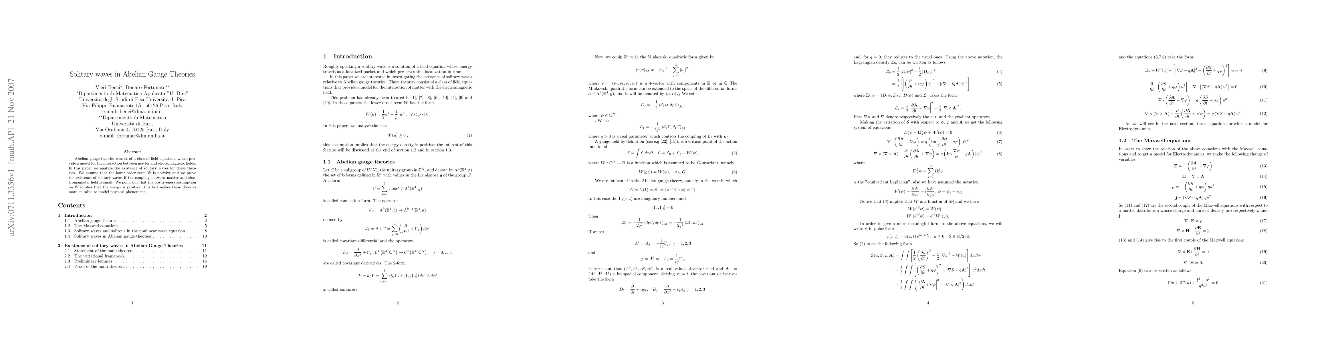 This paper investigates solitary waves in Abelian gauge theories, proving their existence under small coupling between matter and electromagnetic fields, and highlights that the positiveness of the lower order term W ensures positive energy, enhancing the theories' physical relevance.