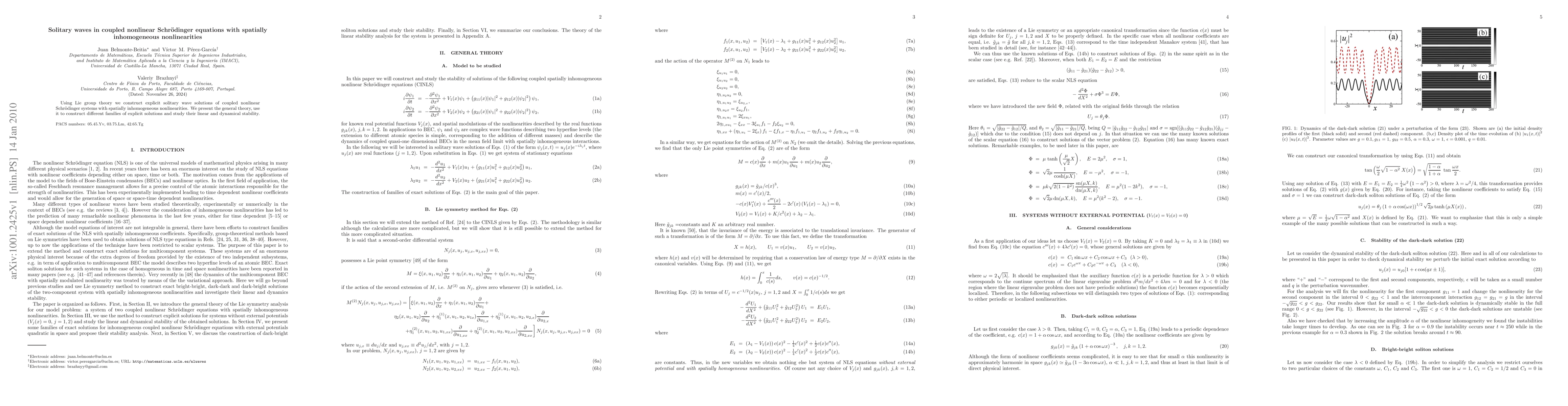 Summary: This paper utilizes Lie group theory to derive explicit solitary wave solutions for coupled nonlinear Schrödinger equations with spatially inhomogeneous nonlinearities, and examines the linear and dynamical stability of these solutions.