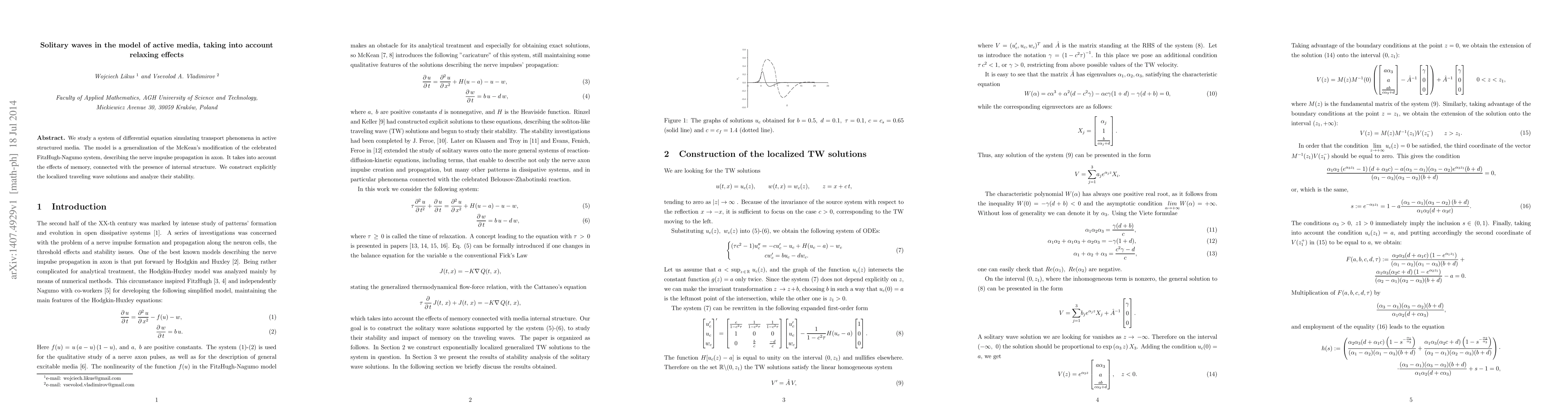Researchers studied a model of active media that simulates nerve impulse propagation in axons, finding localized traveling wave solutions and analyzing their stability. They took into account the effects of memory due to internal structure.