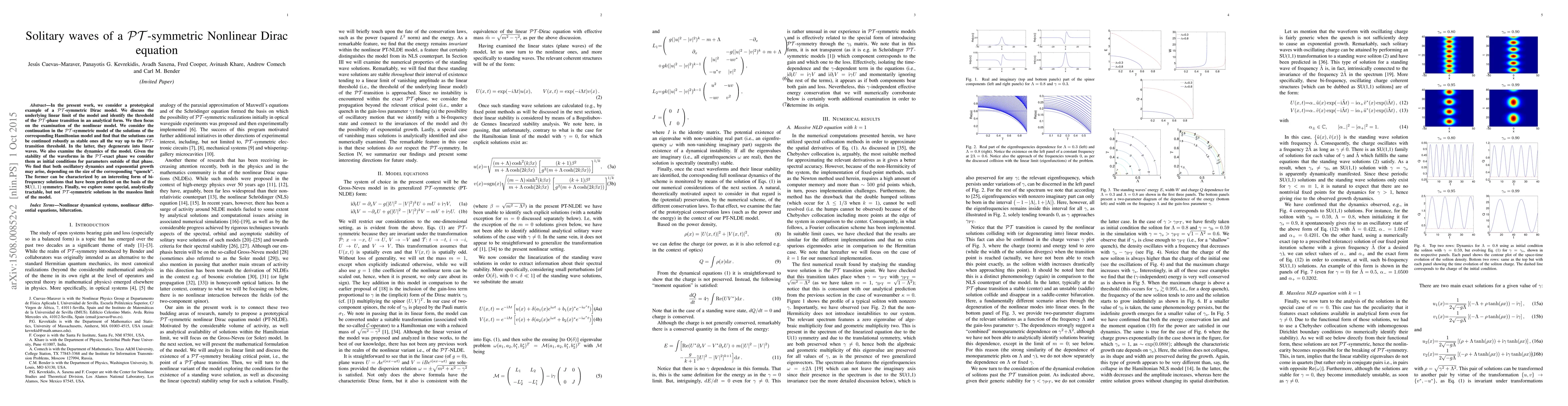Researchers investigate a PT-symmetric Nonlinear Dirac equation, finding stable solitary waves that can continue beyond the phase transition threshold, exhibiting oscillatory dynamics or exponential growth depending on parameters.