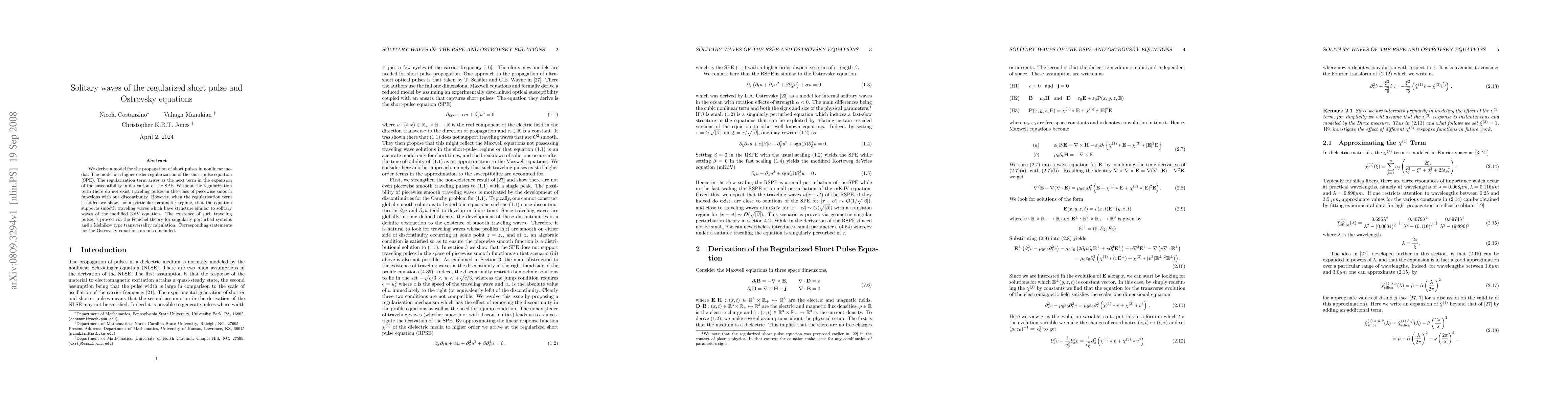 We derive a model for the propagation of short pulses in nonlinear media. The model is a higher order regularization of the short pulse equation (SPE). The regularization term arises as the next term in the expansion of the susceptibility in derivation of the SPE. Without the regularization term there do not exist traveling pulses in the class of piecewise smooth functions with one discontinuity. However, when the regularization term is added we show, for a particular parameter regime, that the equation supports smooth traveling waves which have structure similar to solitary waves of the modified KdV equation. The existence of such traveling pulses is proved via the Fenichel theory for singularly perturbed systems and a Melnikov type transversality calculation. Corresponding statements for the Ostrovsky equations are also included.