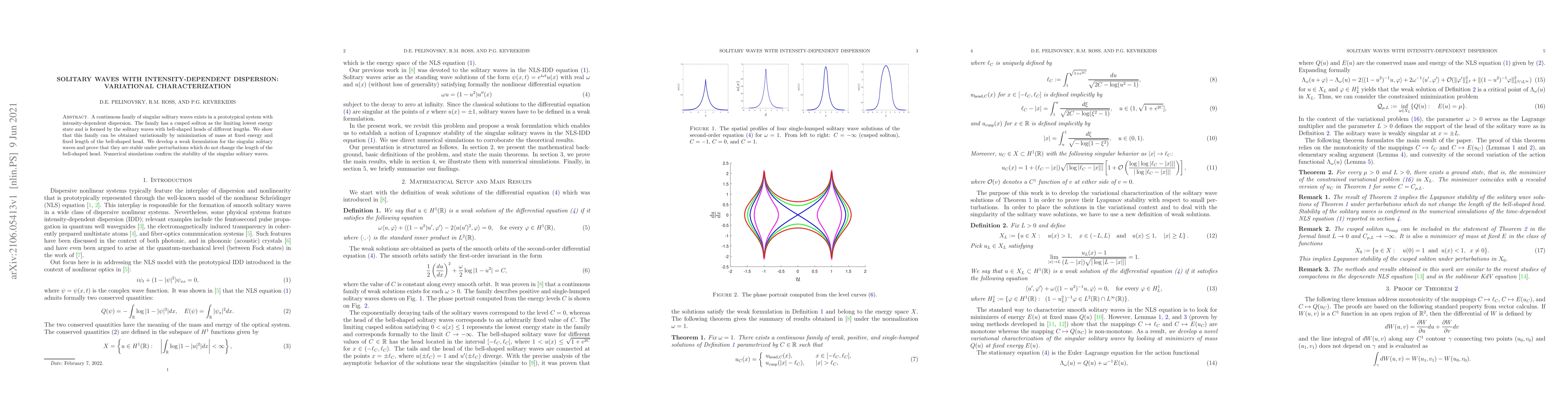 This paper explores a family of singular solitary waves in a system with intensity-dependent dispersion, characterized by bell-shaped heads of varying lengths. The study demonstrates variational characterization through minimization of mass at fixed energy and head length, confirming stability under certain perturbations via numerical simulations.