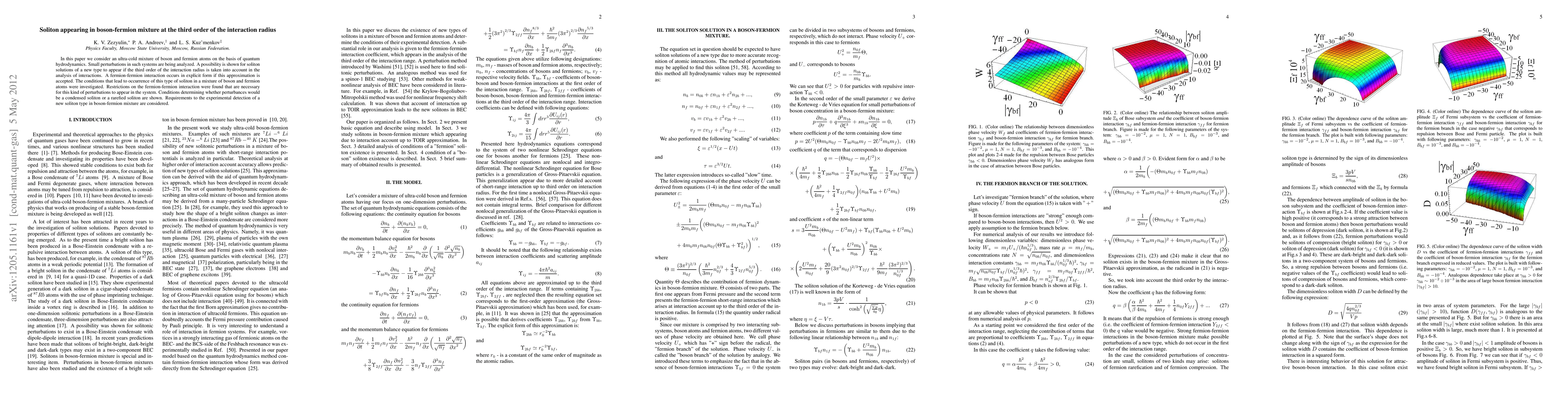 In this paper we consider an ultra-cold mixture of boson and fermion atoms on the basis of quantum hydrodynamics. Small perturbations in such systems are being analyzed. A possibility is shown for soliton solutions of a new type to appear if the third order of the interaction radius is taken into account in the analysis of interactions. A fermion-fermion interaction occurs in explicit form if this approximation is accepted. The conditions that lead to occurrence of this type of soliton in a mixture of boson and fermion atoms were investigated. Restrictions on the fermion-fermion interaction were found that are necessary for this kind of perturbations to appear in the system. Conditions determining whether perturbances would be a condensed soliton or a rarefied soliton are shown. Requirements to the experimental detection of a new soliton type in boson-fermion mixture are considered.